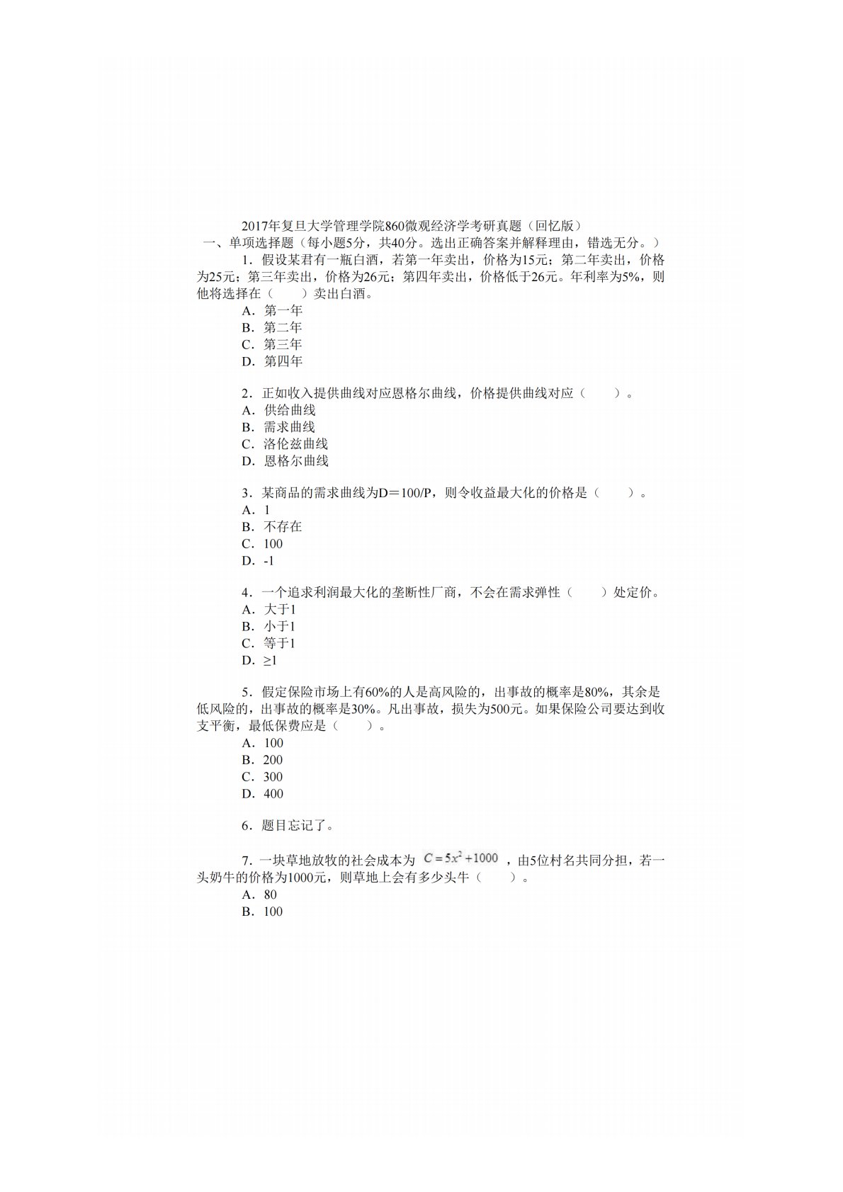 复旦大学860微观经济学2017年真题回忆版