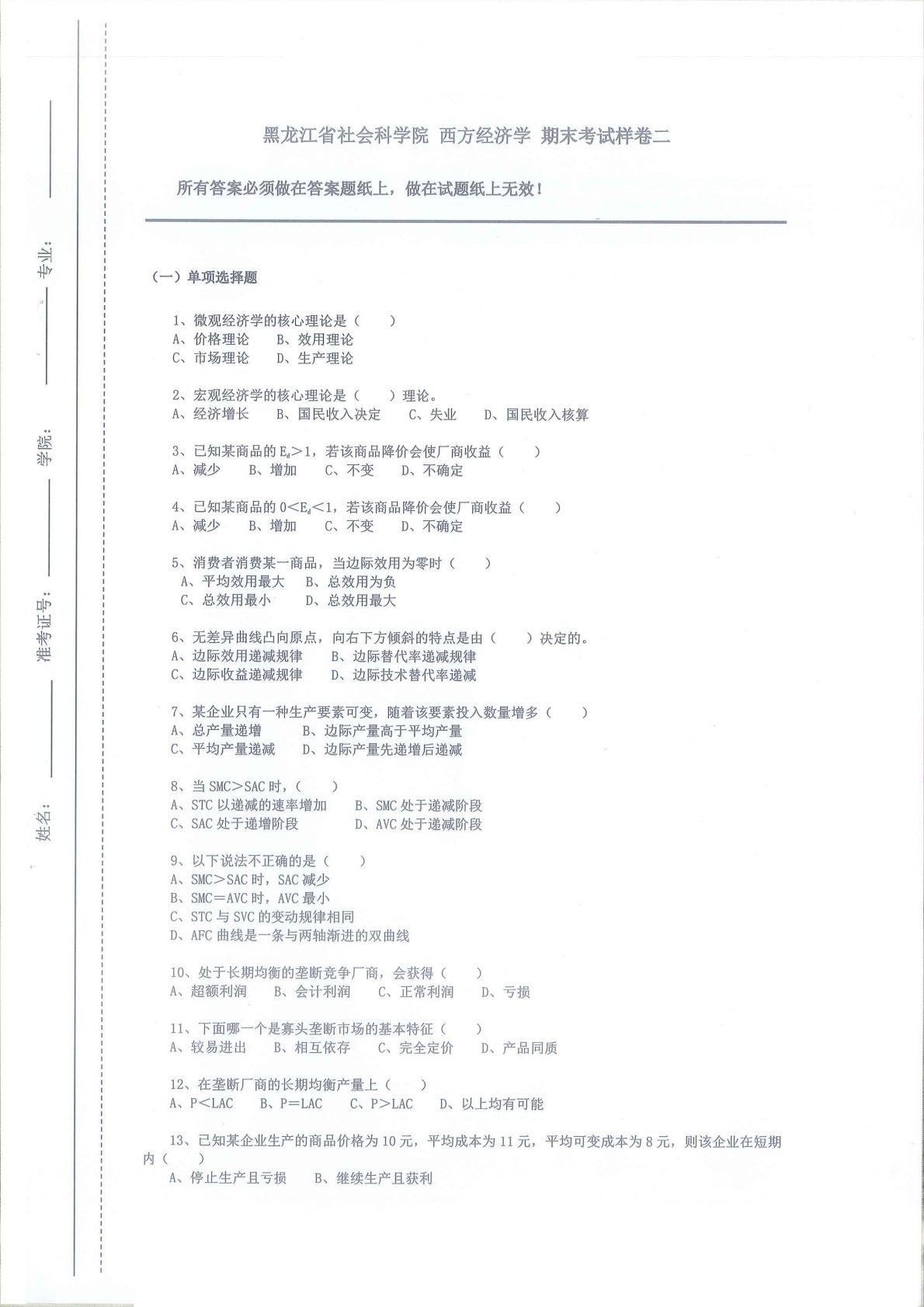 黑龙江省社会科学院801西方经济学期末考试样卷二