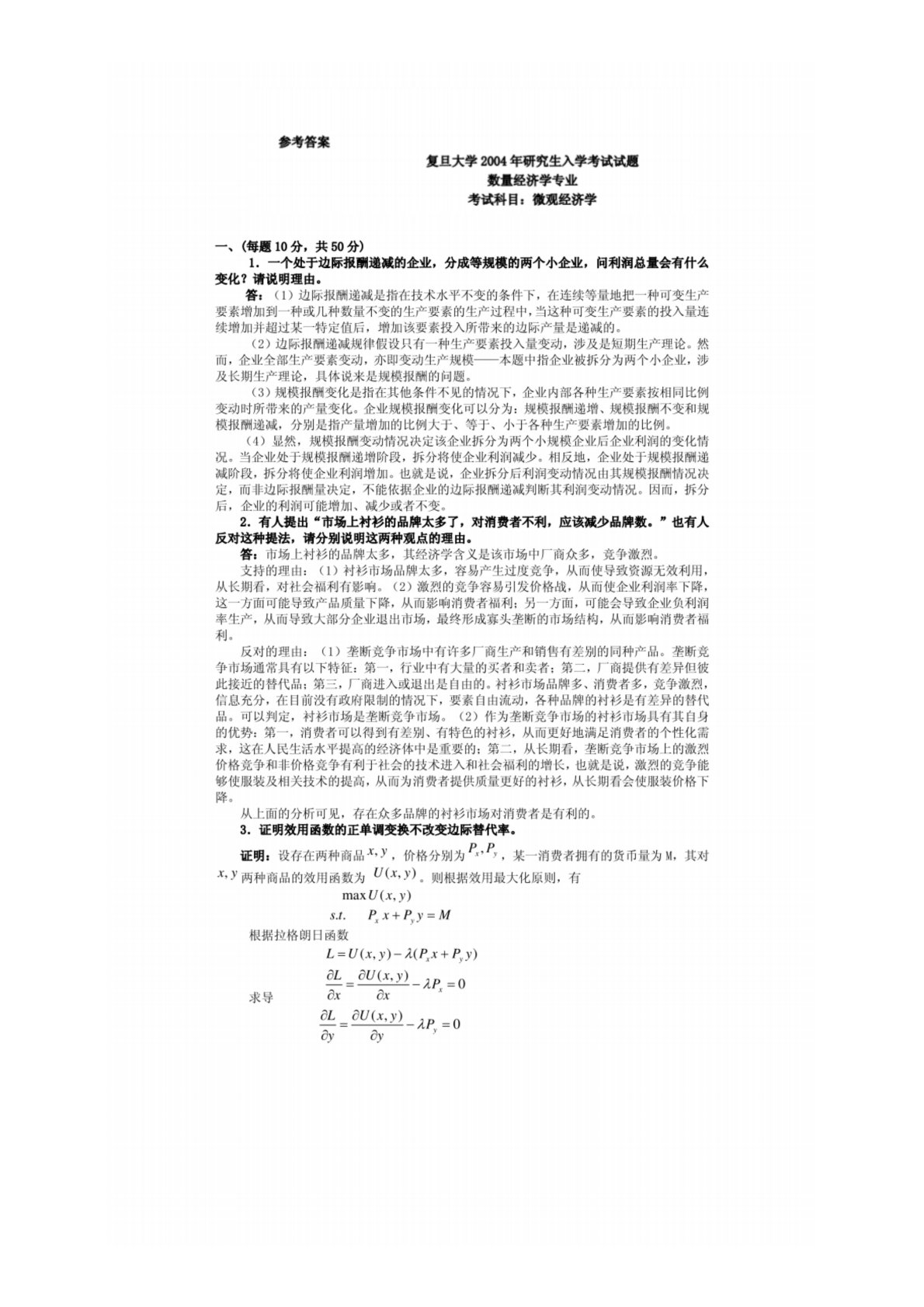 复旦大学860微观经济学2004年真题答案