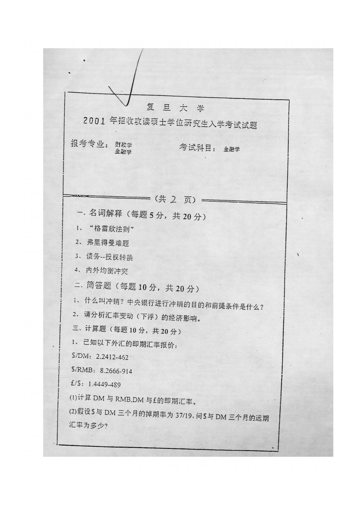 复旦大学431金融学综合2001年真题