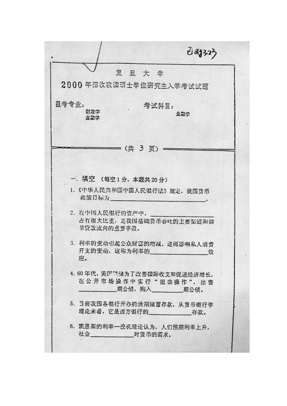 复旦大学431金融学综合2000年真题