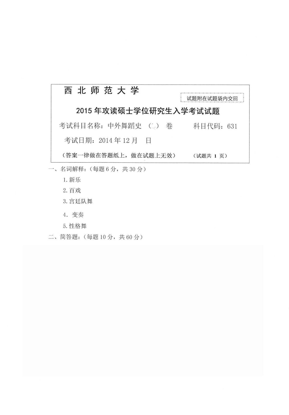 西北师范大学631中外舞蹈史2015年真题