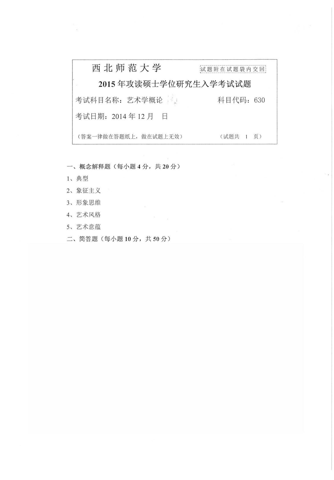 西北师范大学630文化艺术综合2015年真题