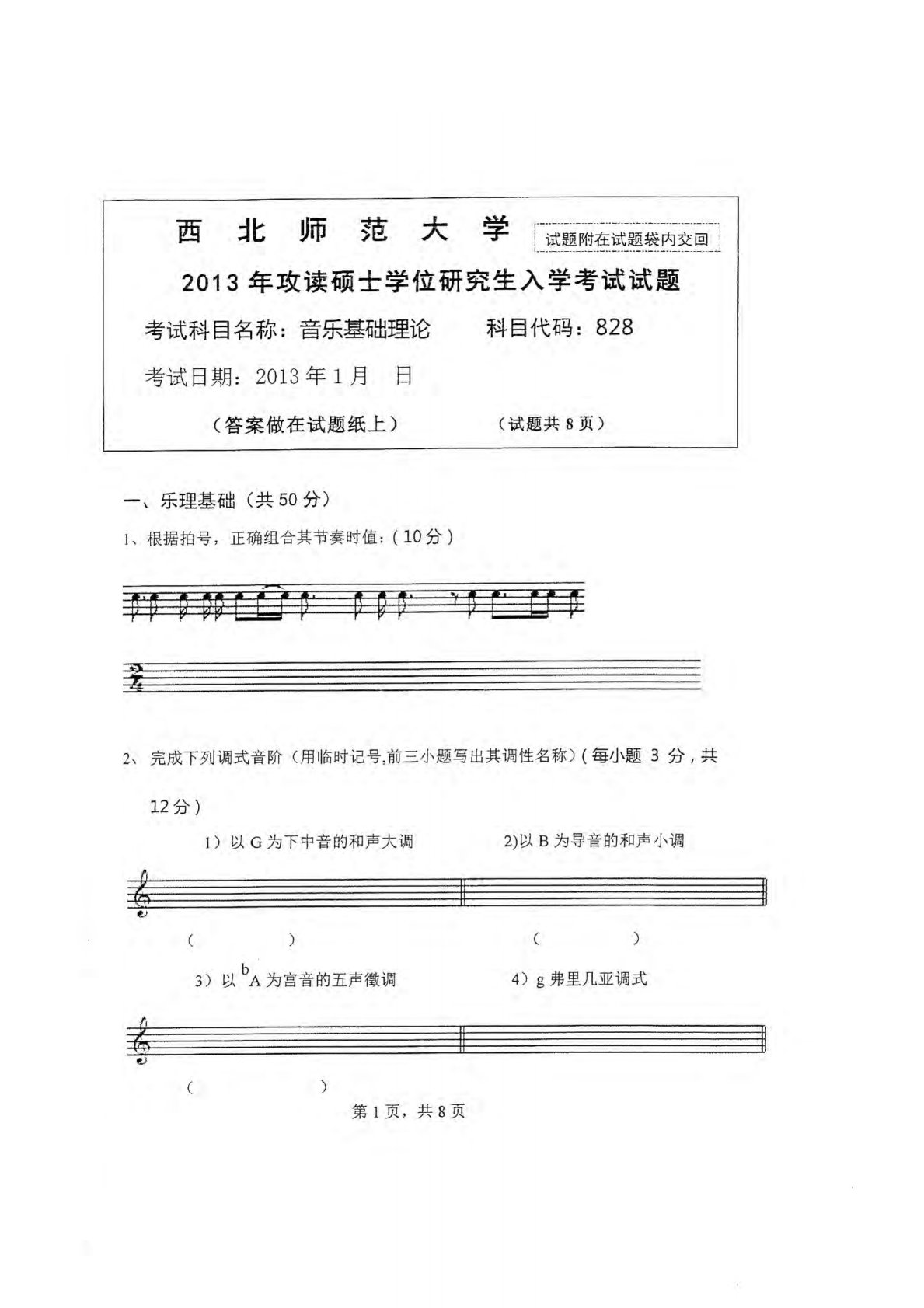 西北师范大学827音乐基础理论2013年真题