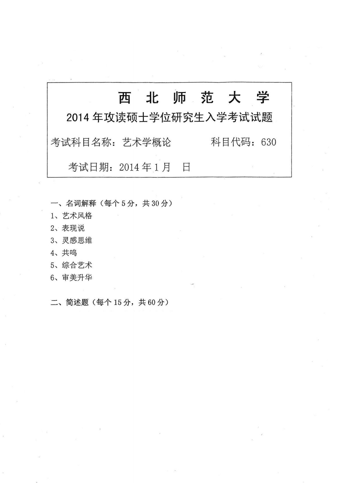 西北师范大学630文化艺术综合2014年真题