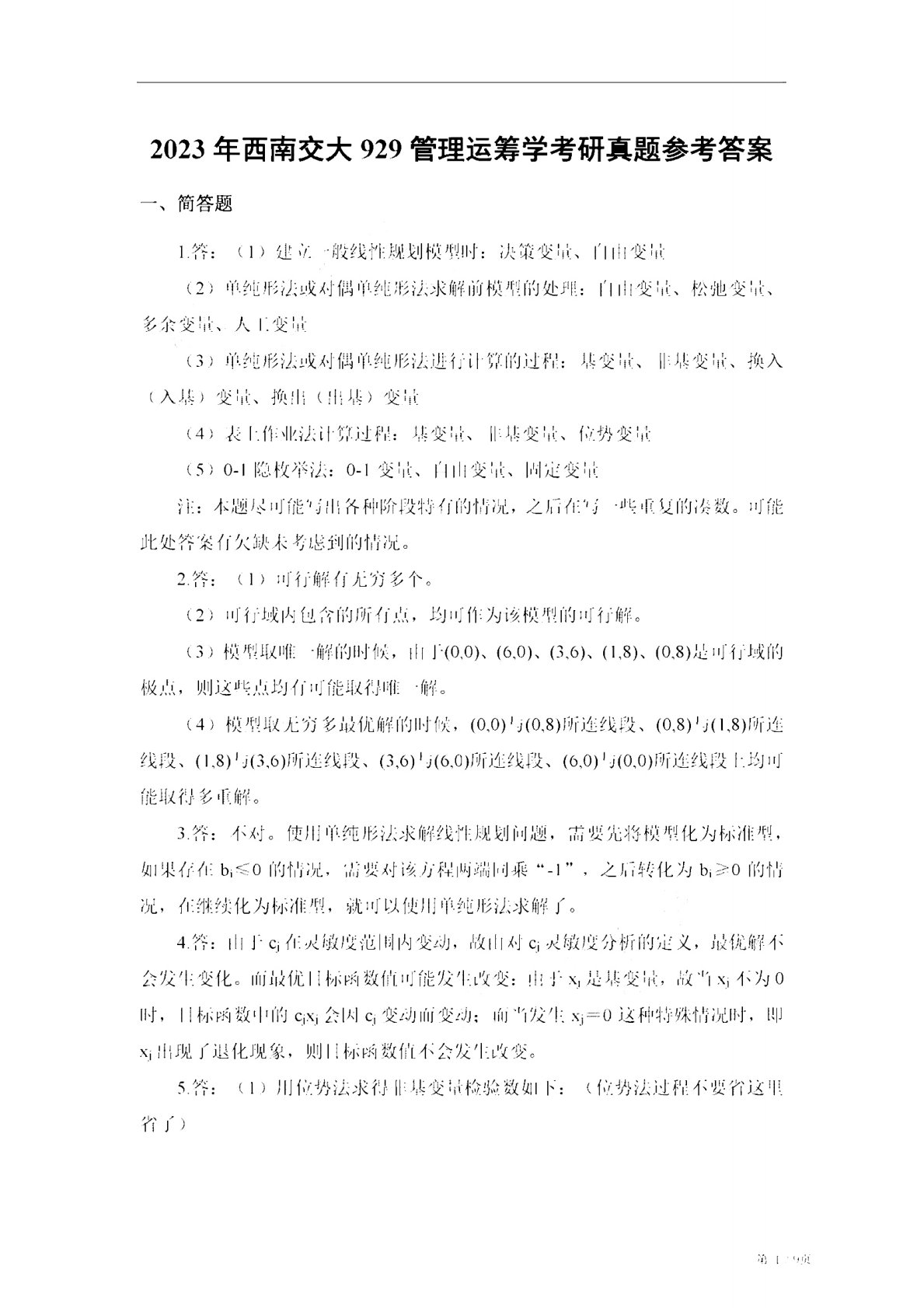 西南交通大学929管理运筹学2023年真题答案回忆版
