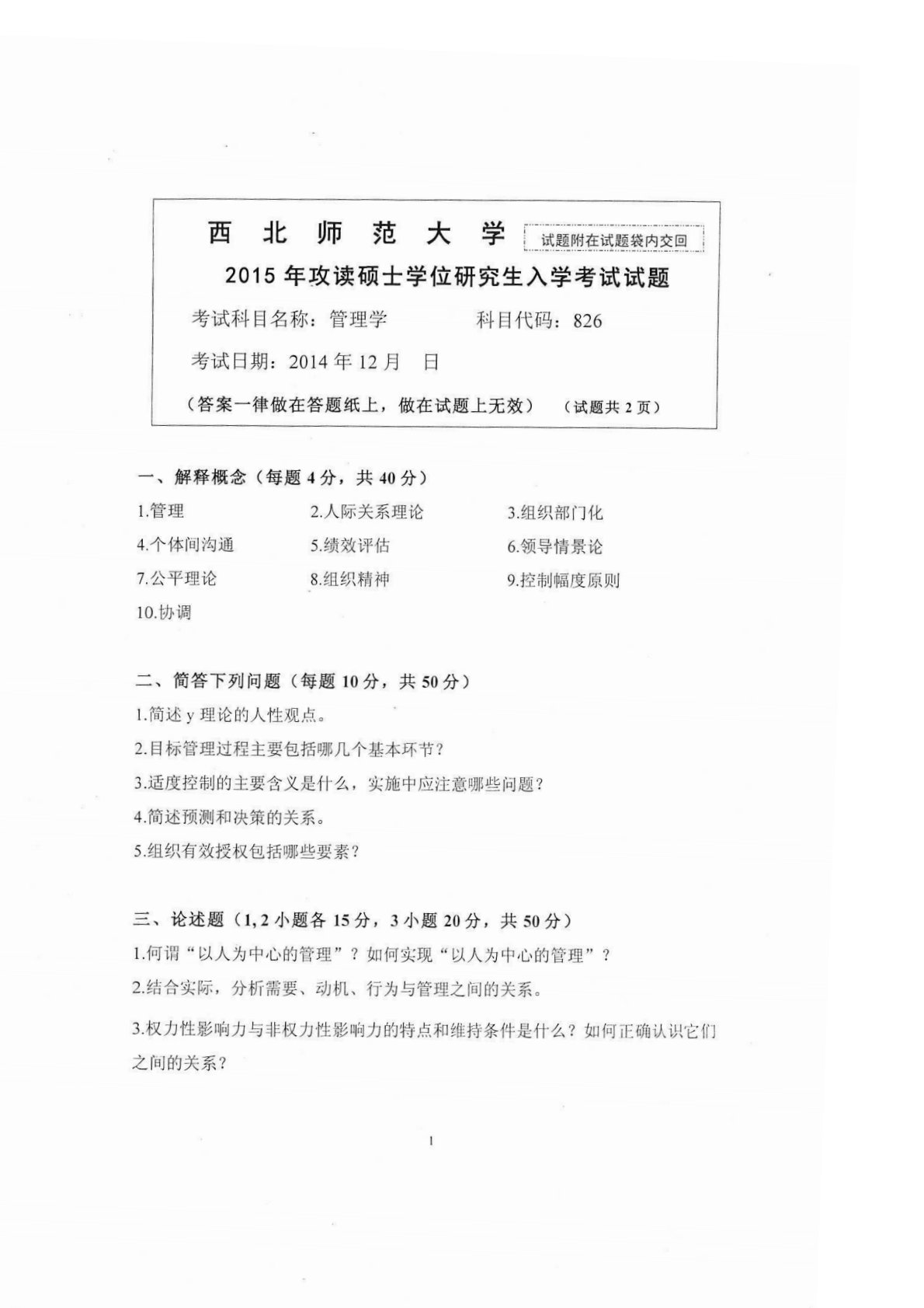 西北师范大学826管理学2015年真题