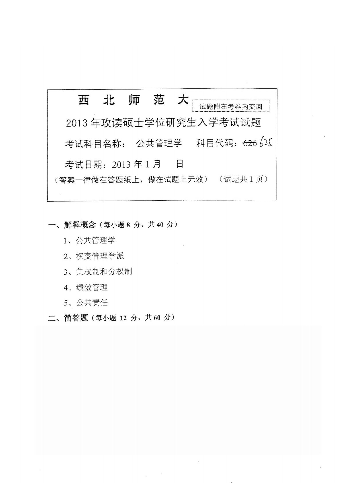 西北师范大学625公共管理学2013年真题