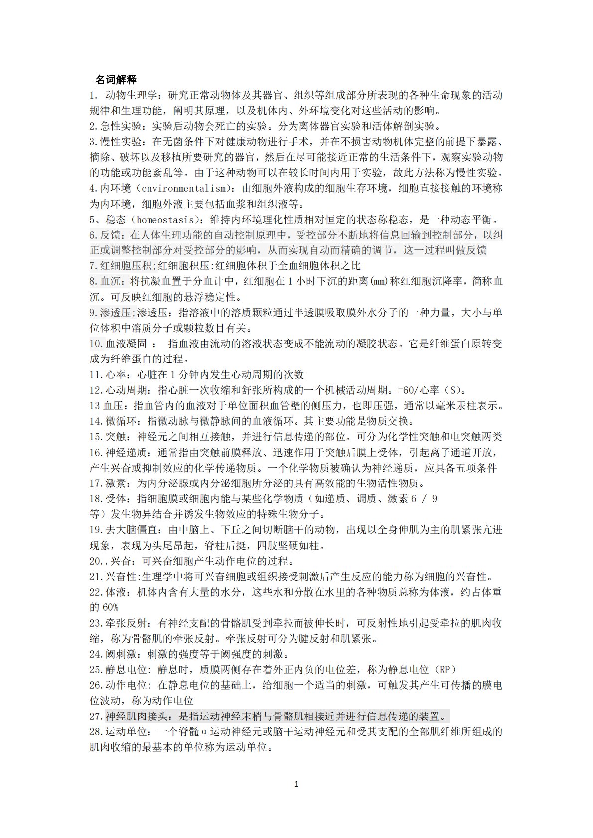 1名词解释1.动物生理学:研究正常动物体及其器官、组织等组成部分所表现的各种生命现象的活动规律和生理功能,阐明其原理,以及机体内、外环境变化对这些活动的影响。2.急性实验:实验后动物会死亡的实验。分为离体器官实验和活体解剖实验。3.慢性实验:在无菌条件下对健康动物进行手术,并在不损害动物机体完整的前提下暴露、摘除、破坏以及移植所要研究的器官,然后在尽可能接近正常的生活条件下,观察实验动物的功能或功能紊乱等。由于这种动物可以在较长时间内用于实验,故此方法称为慢性实验。4.内环境(environmentalism):由细胞外液构成的细胞生存环境,细胞直接接触的环境称为内环境,细胞外液主要包括血浆和...