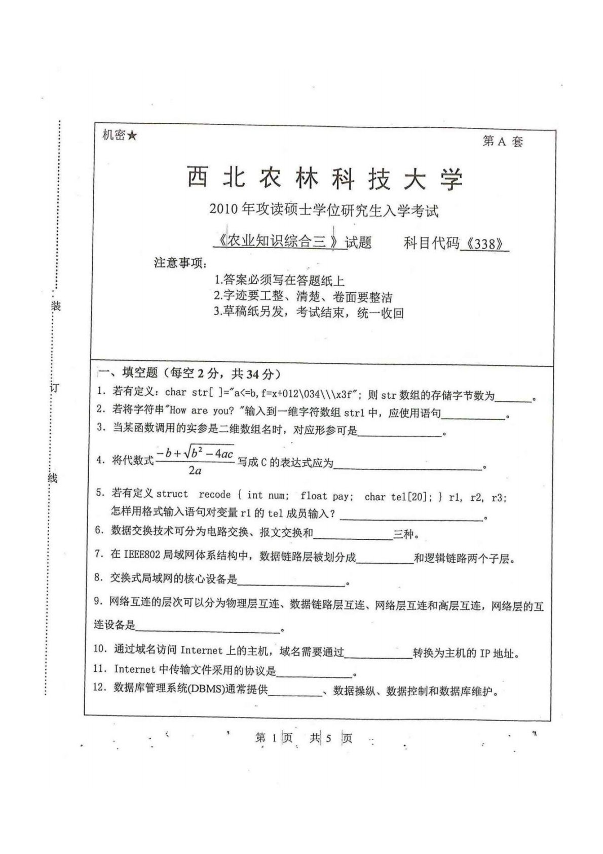 西北农林科技大学341农业知识综合三2010年真题