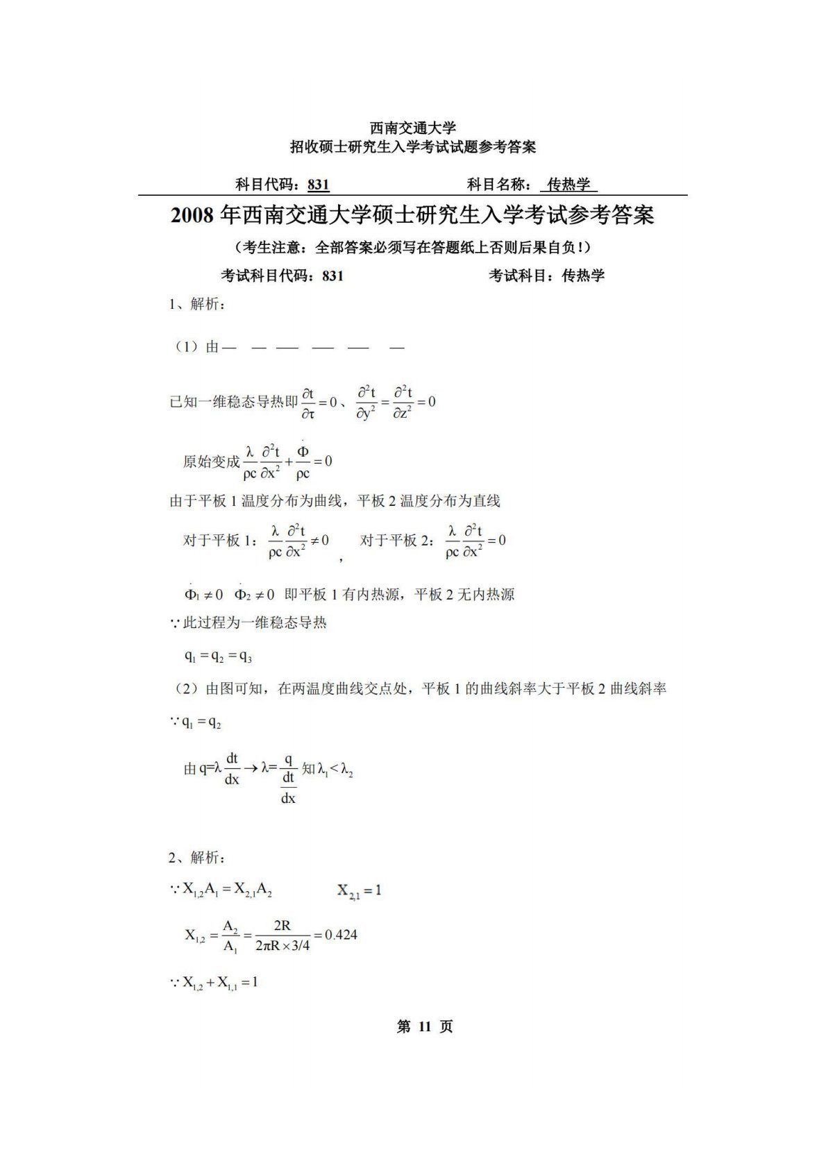 西南交通大学831传热学2008年真题答案