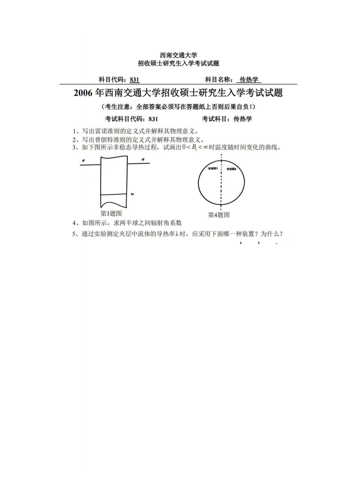 西南交通大学831传热学2006年真题