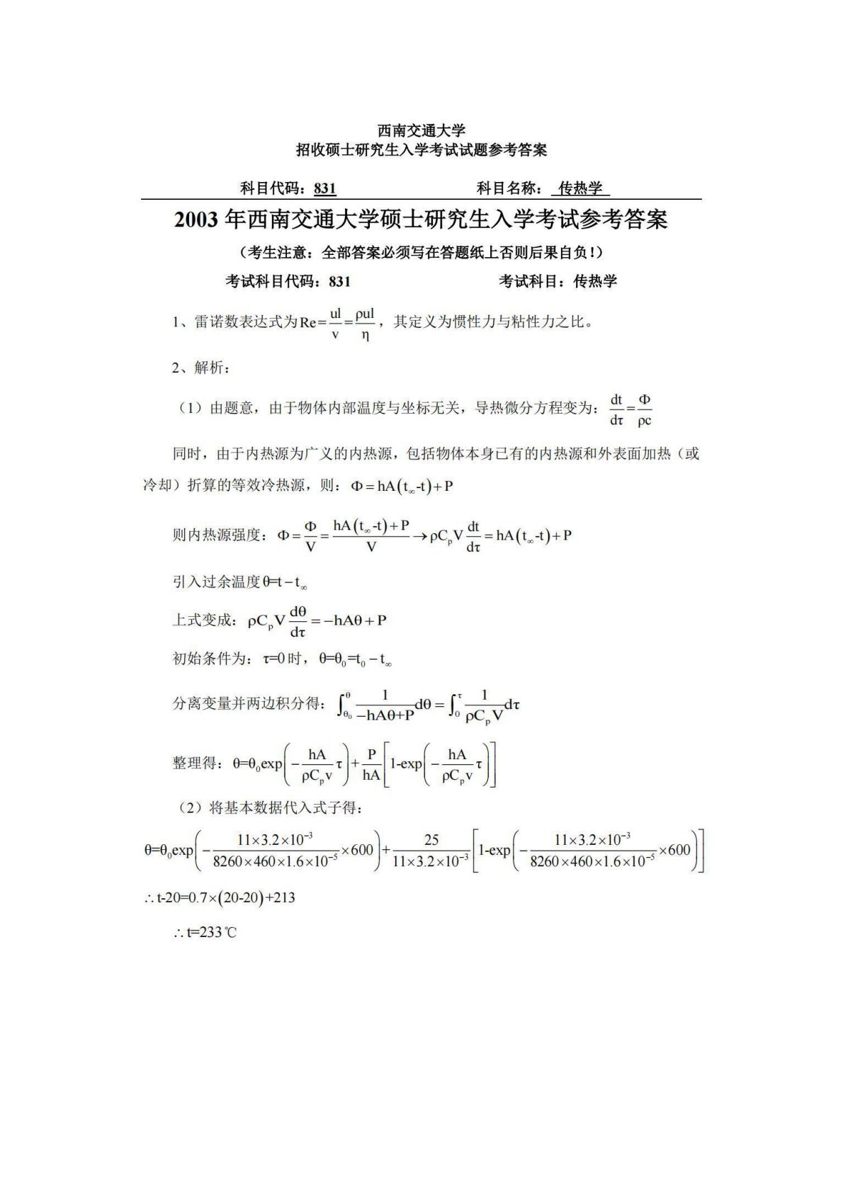 西南交通大学831传热学2003年真题答案
