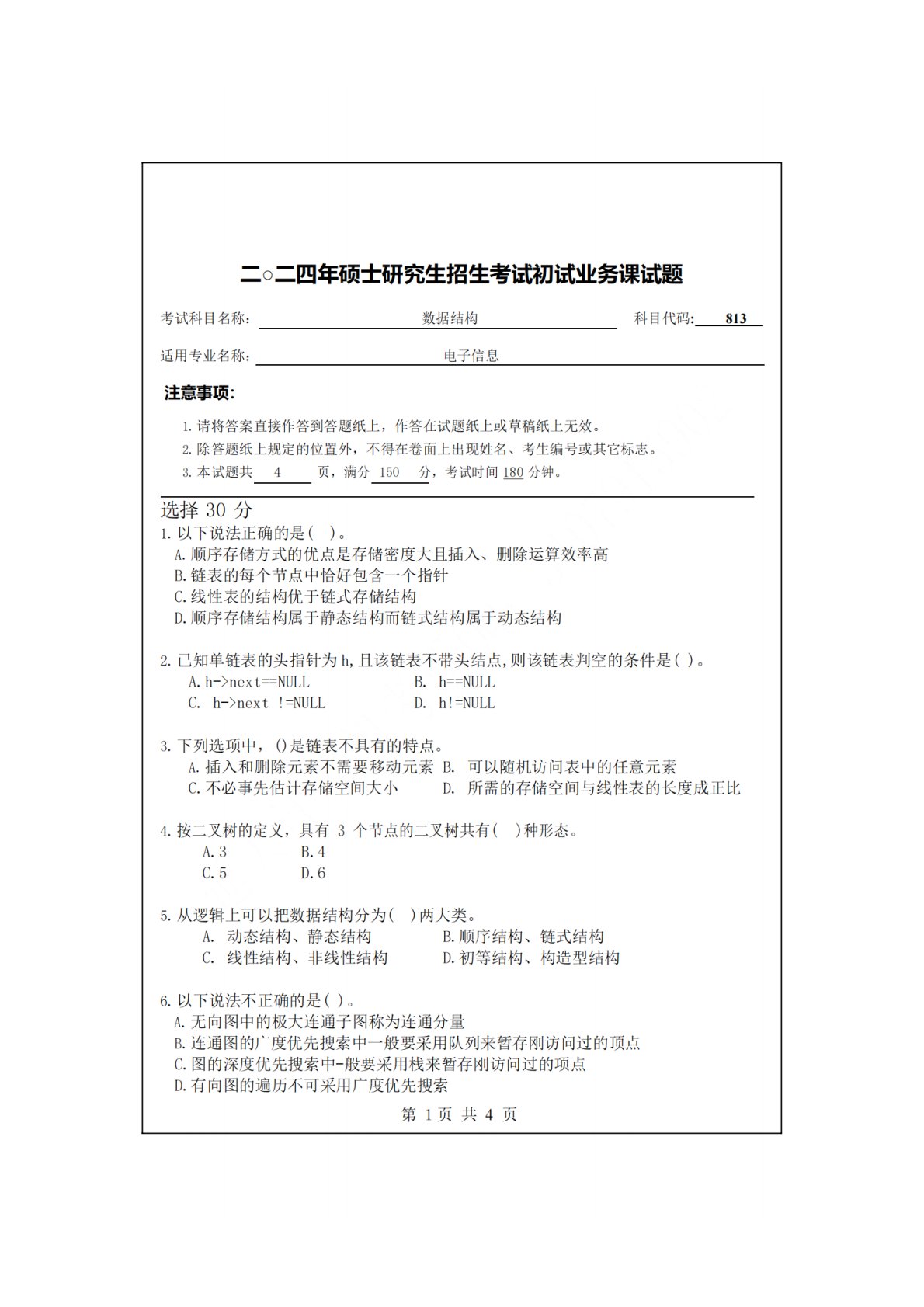 延安大学813数据结构2024年真题