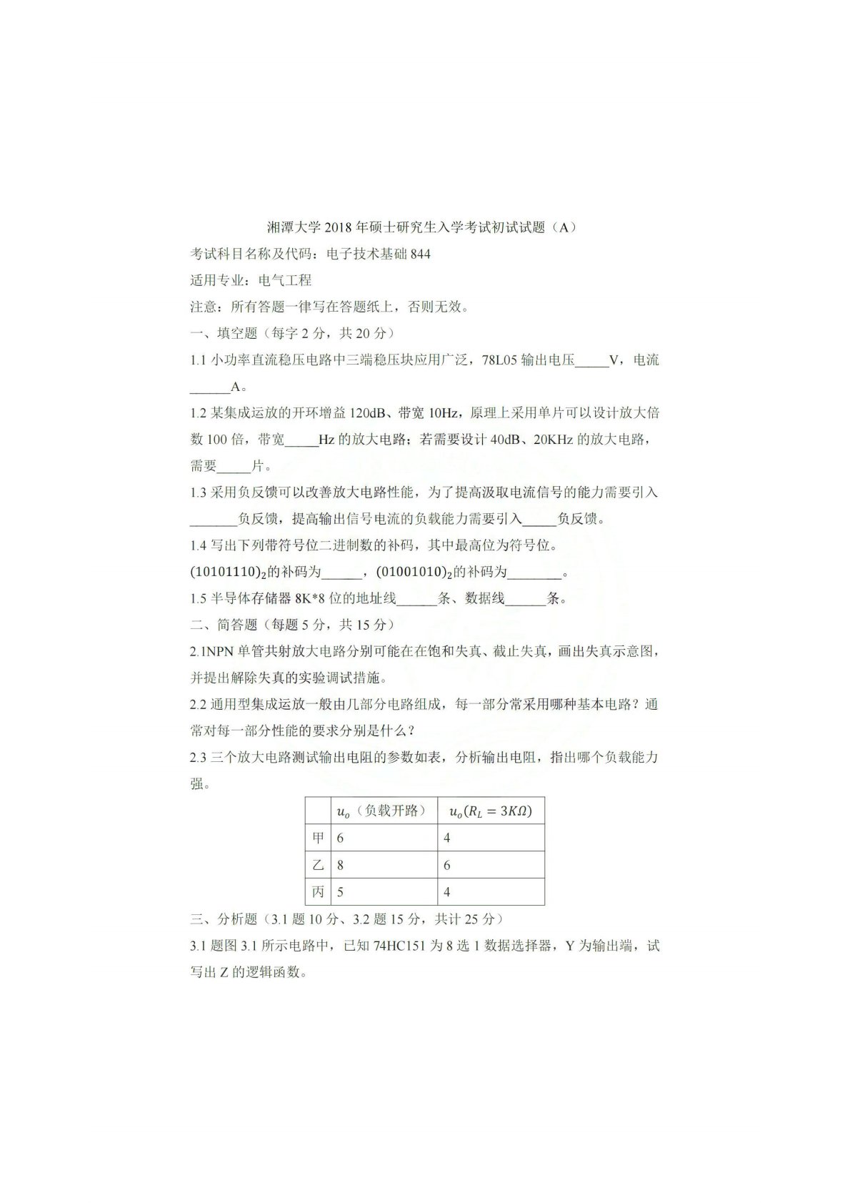 湘潭大学834电子技术基础2018年真题