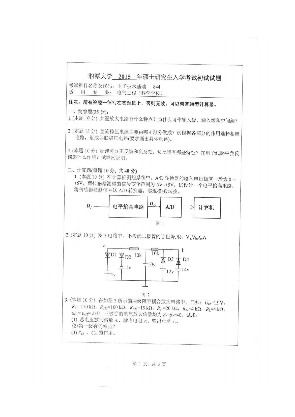 湘潭大学834电子技术基础2015年真题