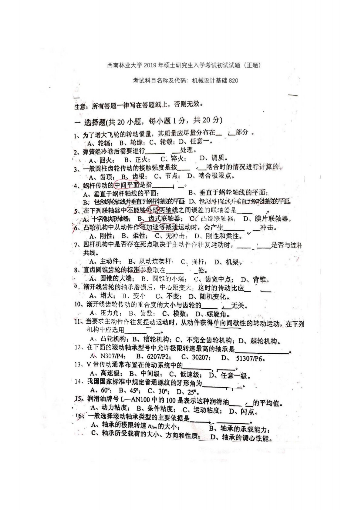 西南林业大学820机械设计基础2019真题
