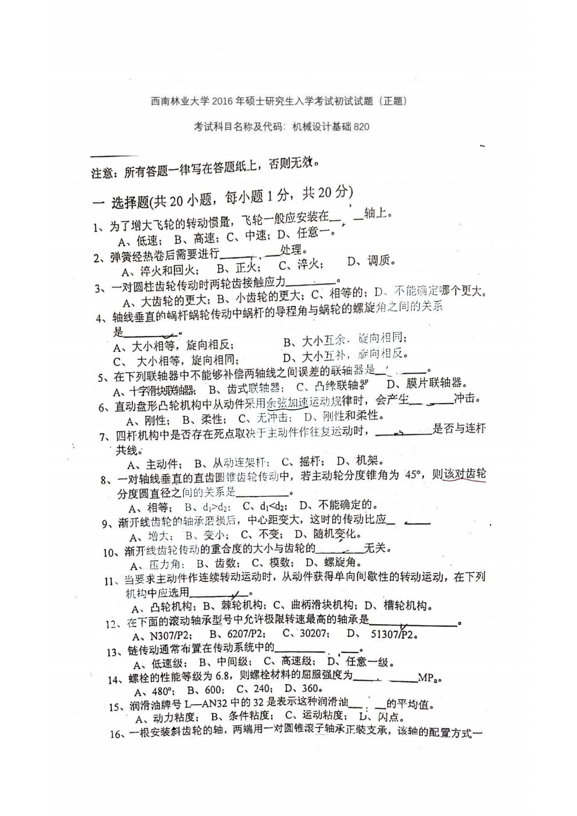 西南林业大学820机械设计基础2016真题
