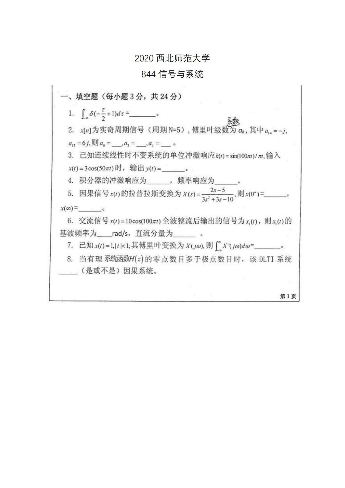 西北师范大学844信号与系统2020年真题