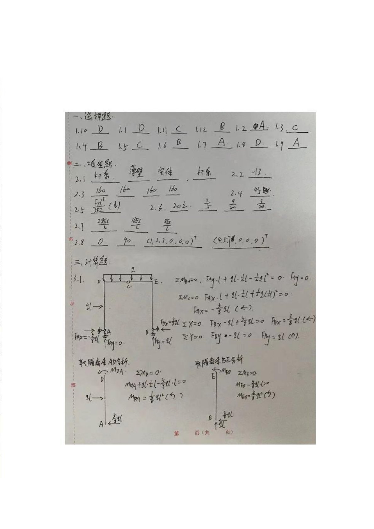 湘潭大学839结构力学2013年真题答案手写版