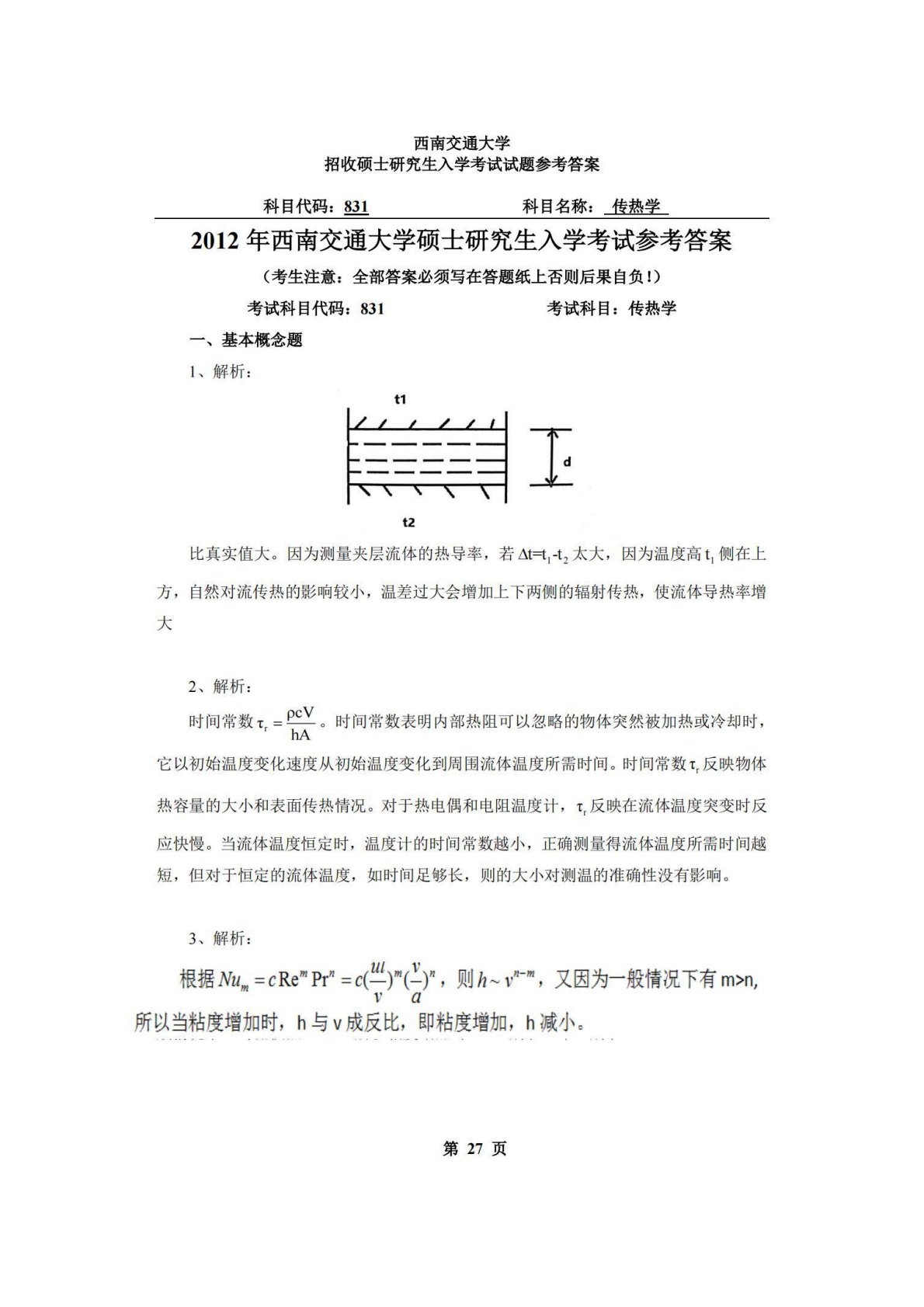 西南交通大学831传热学2012年真题答案