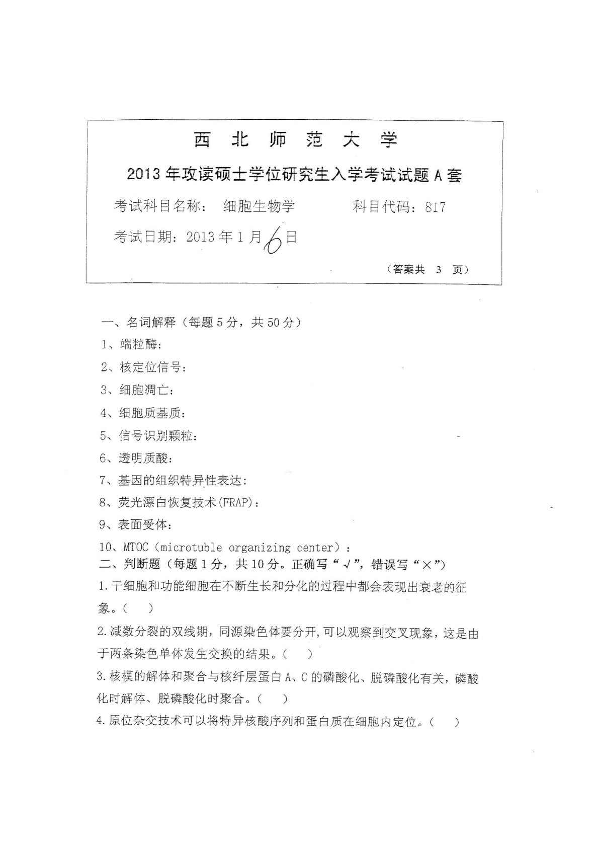 西北师范大学816细胞生物学2013年真题