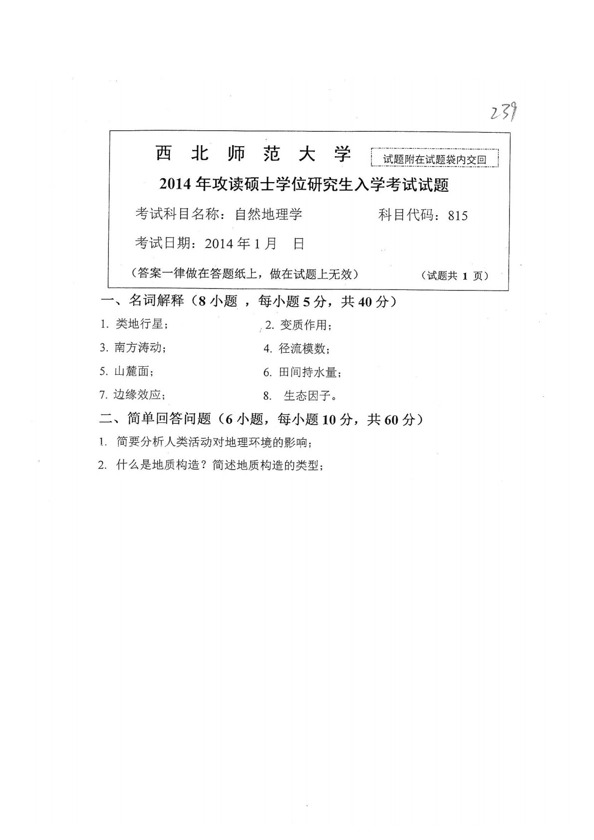 西北师范大学509自然地理学(同等学力和跨专业加试)2014年真题