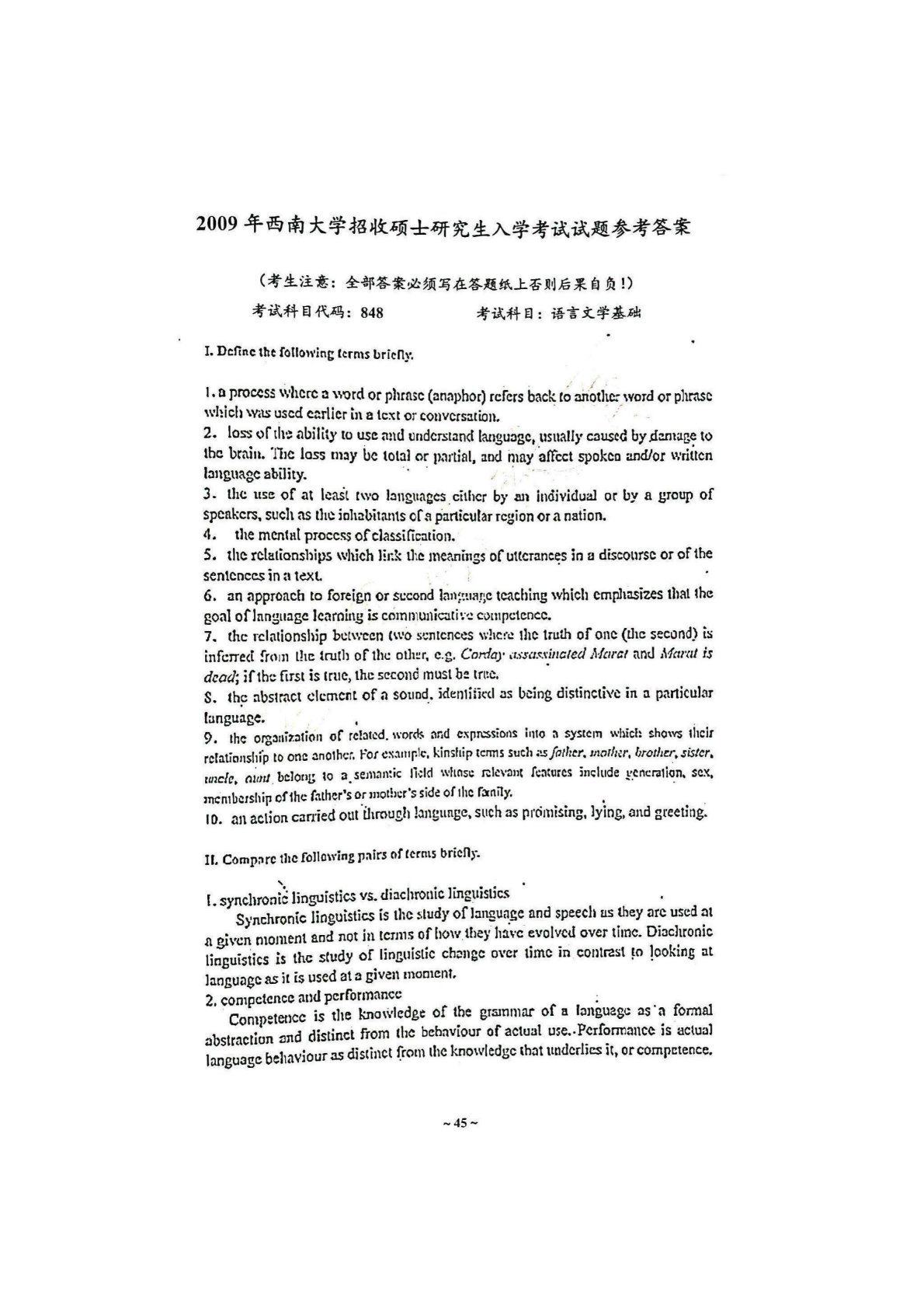 西南大学848语言文学基础2009年真题答案