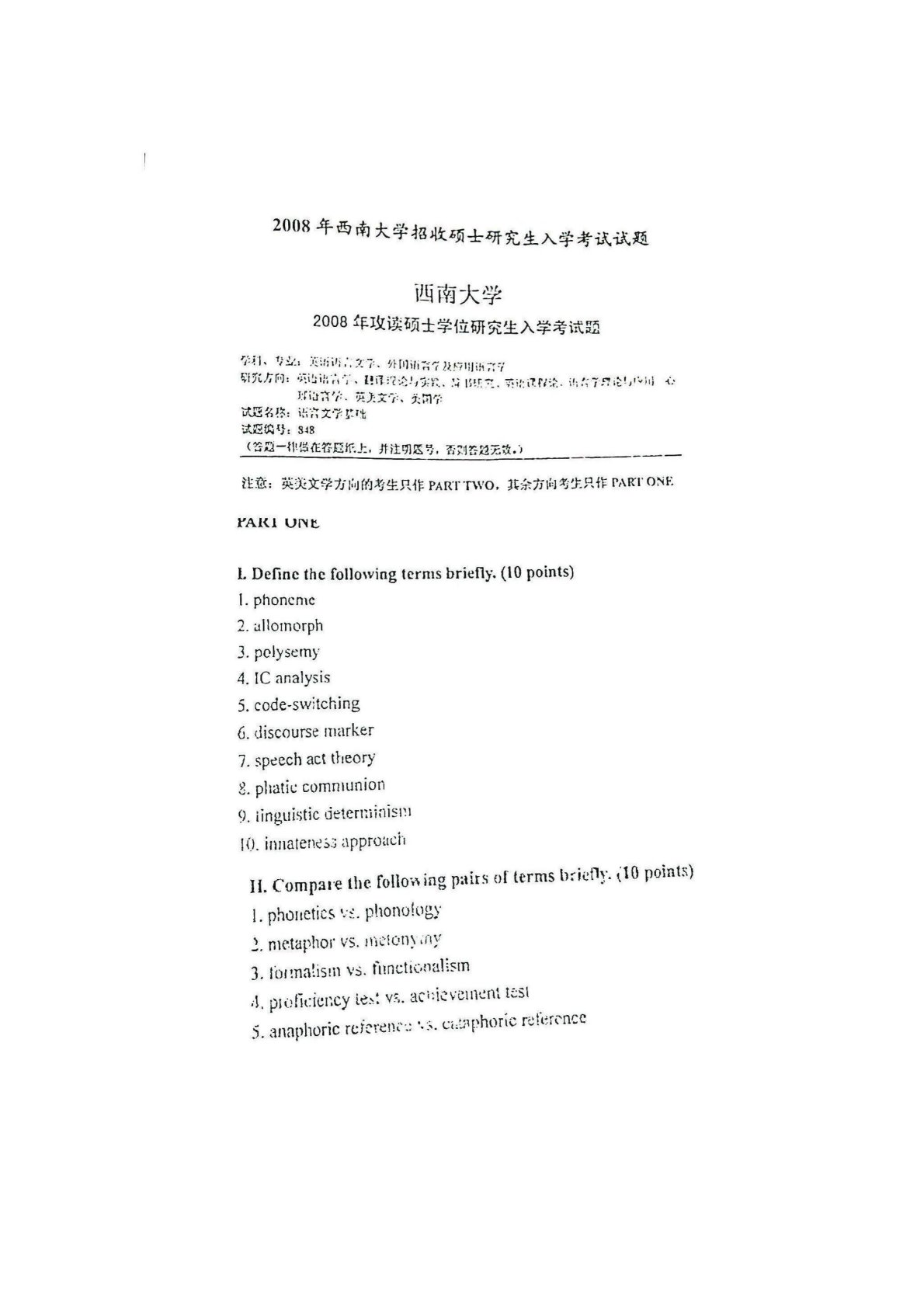 西南大学848语言文学基础2008年真题