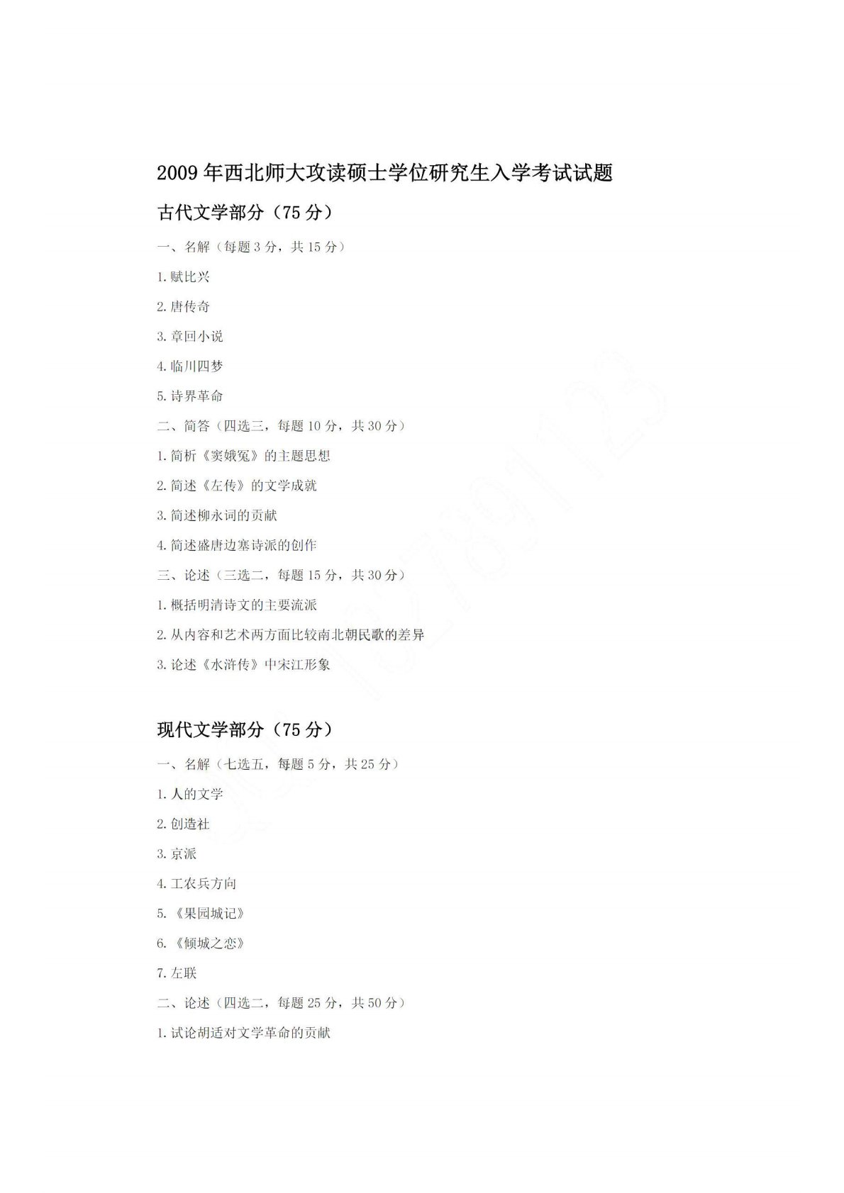 西北师范大学618中国文学2009年真题