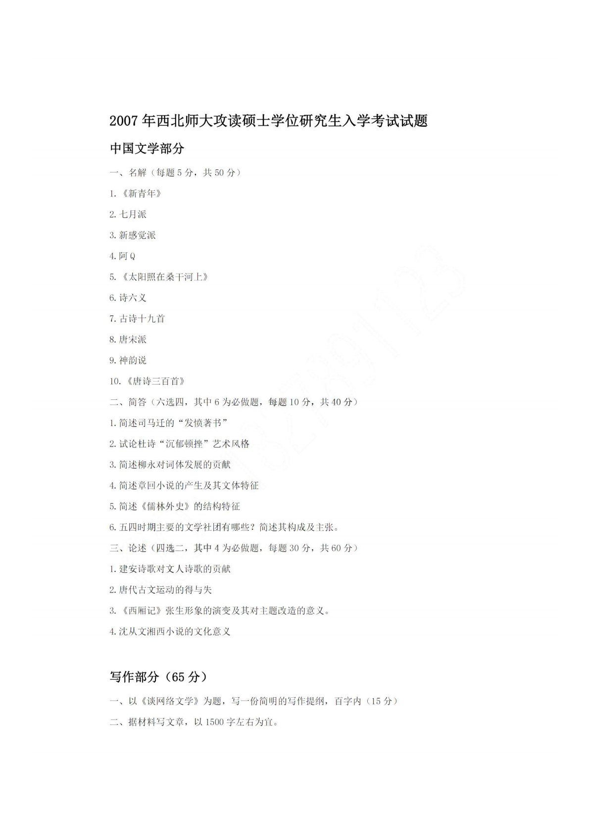 西北师范大学618中国文学2007年真题