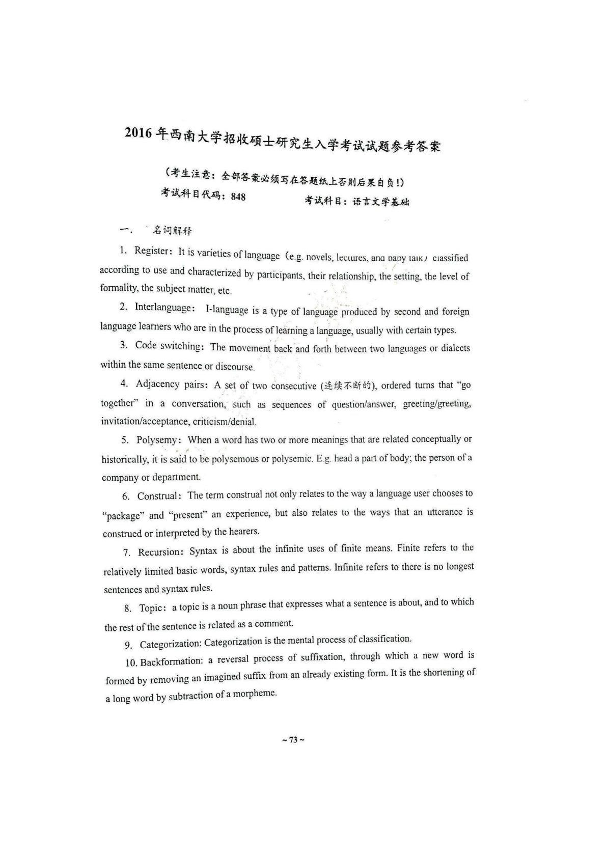 西南大学848语言文学基础2016年真题答案