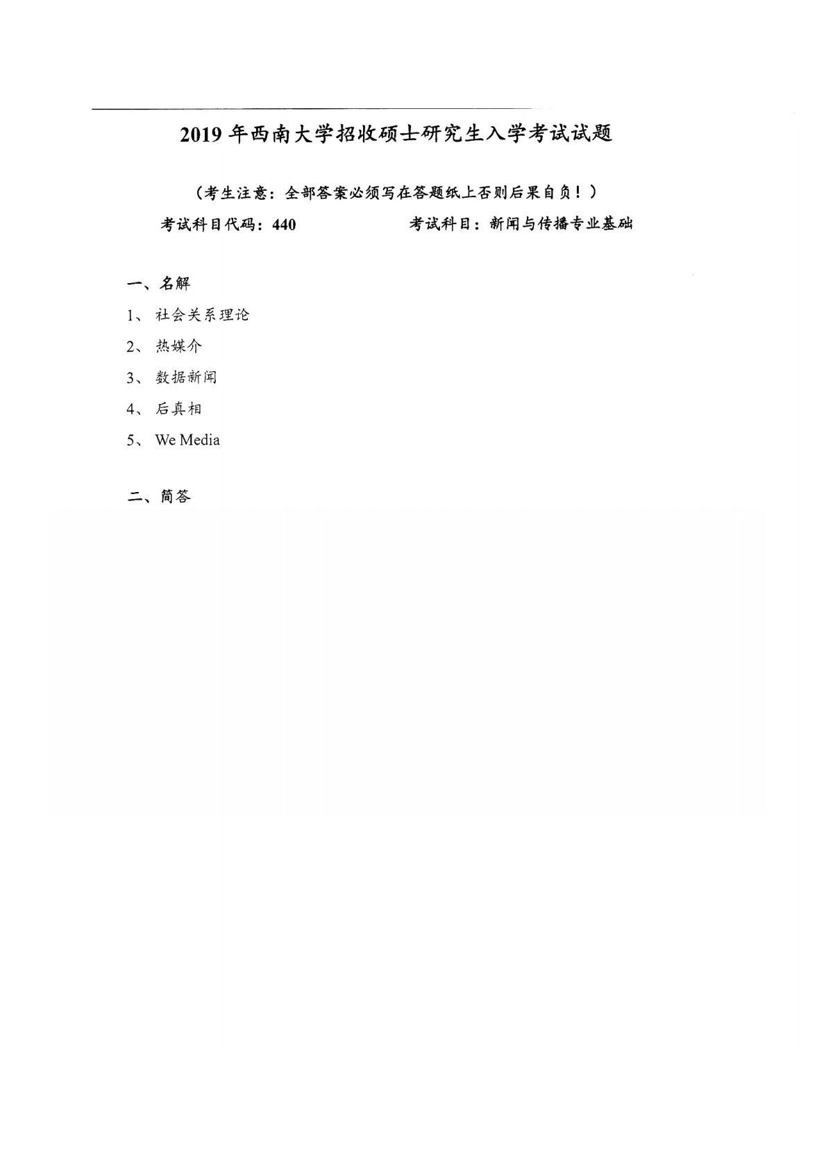 西南大学440新闻与传播专业基础2019年真题
