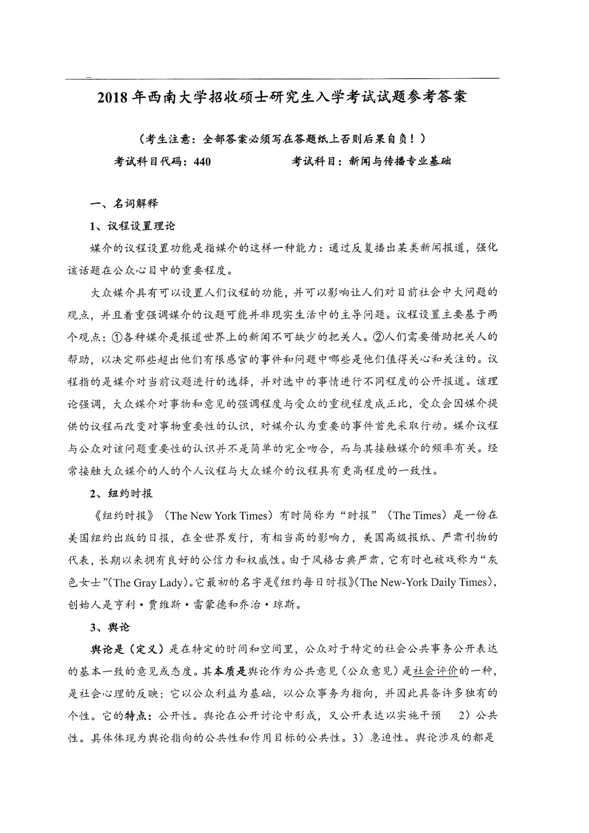 西南大学440新闻与传播专业基础2018年真题答案
