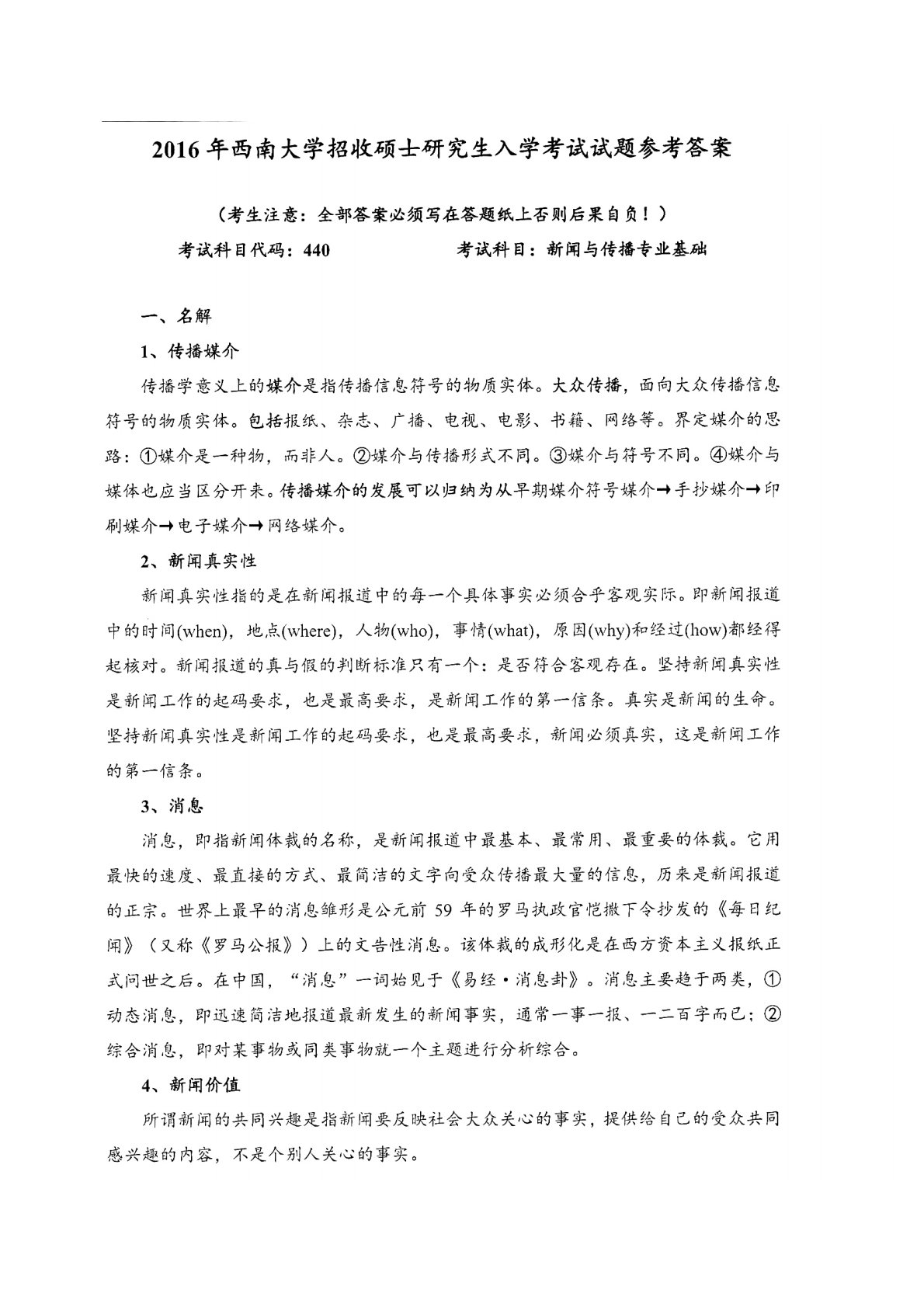 西南大学440新闻与传播专业基础2016年真题答案