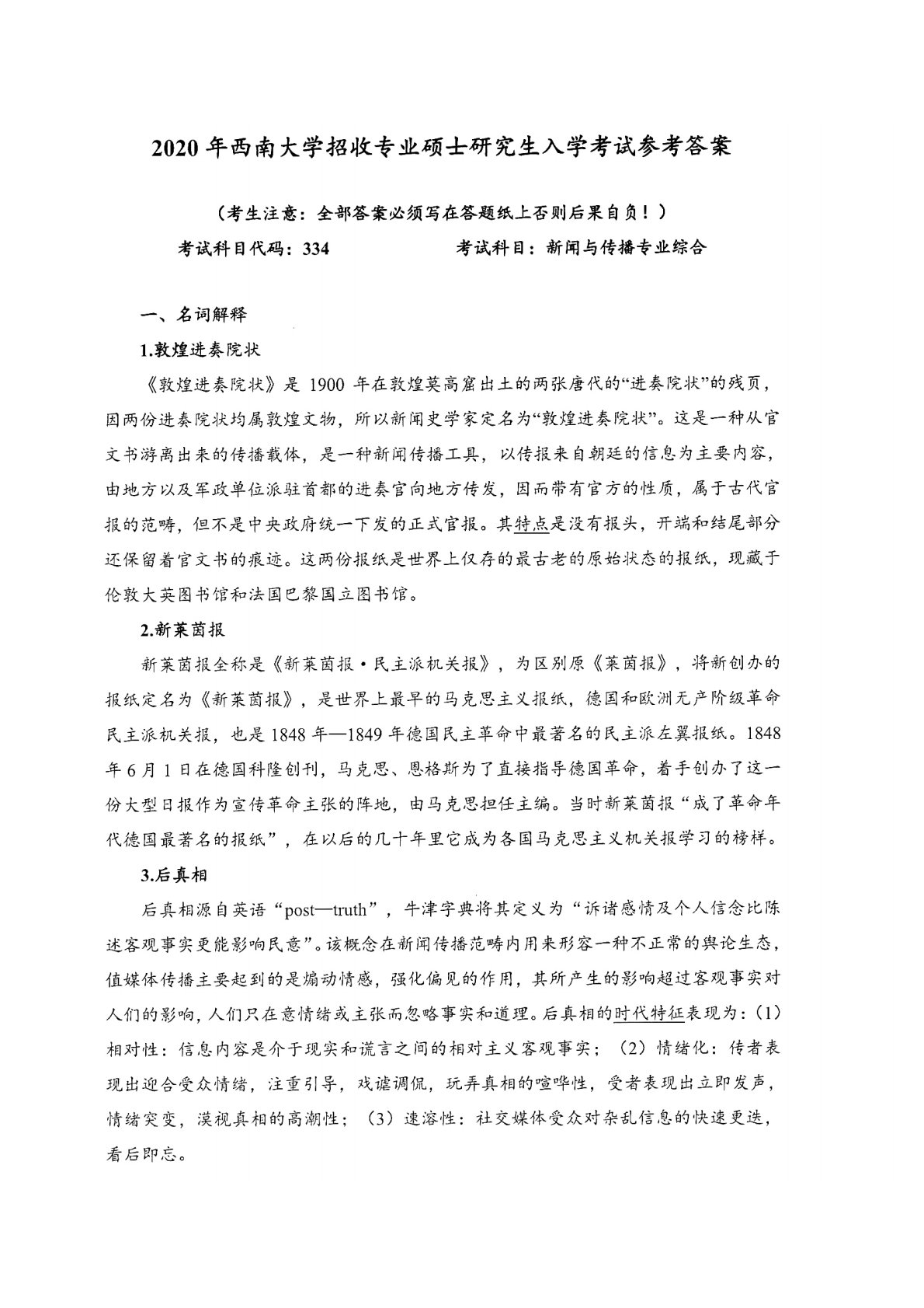 西南大学334新闻与传播专业综合能力2020年真题答案