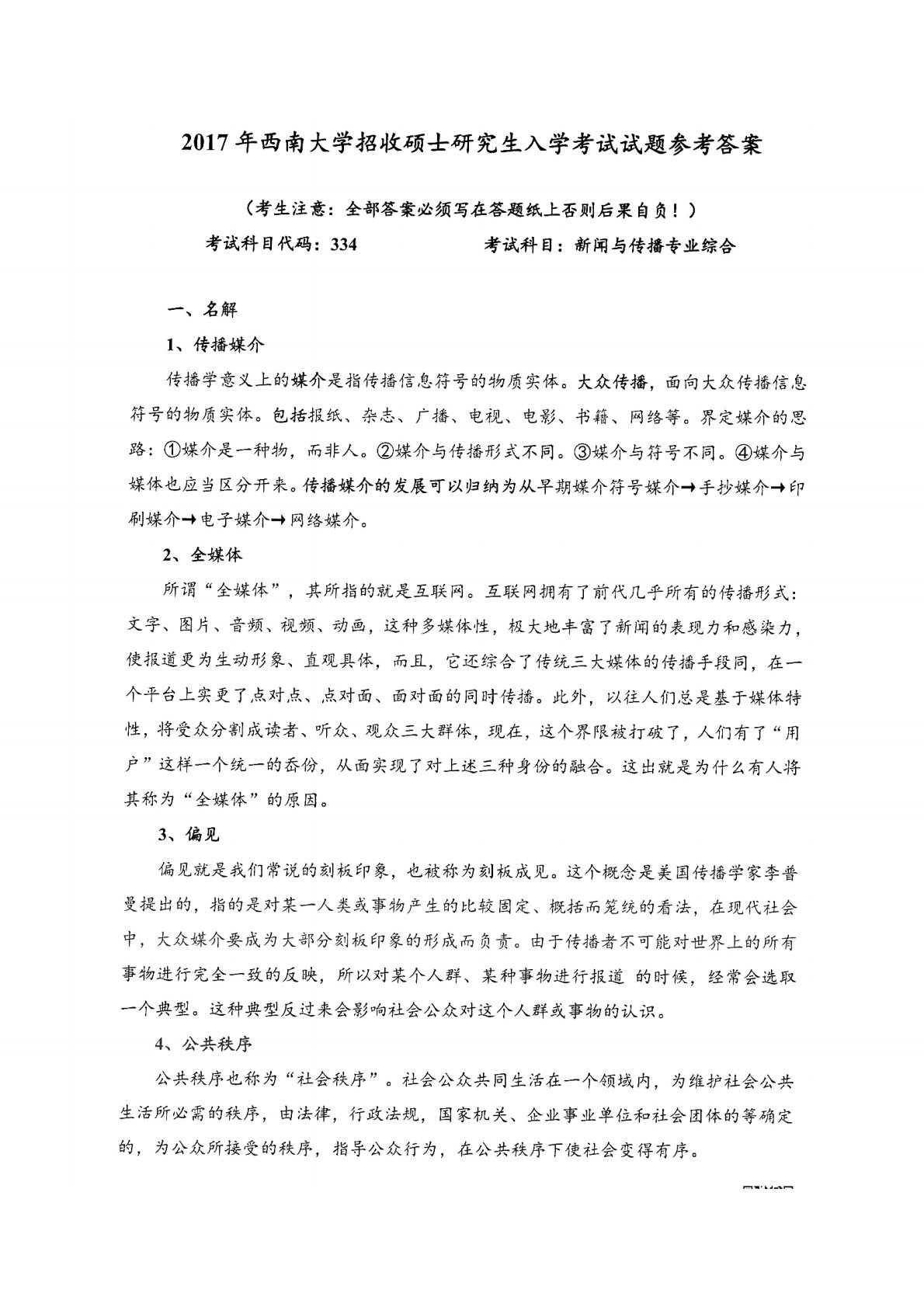 西南大学334新闻与传播专业综合能力2017年真题答案