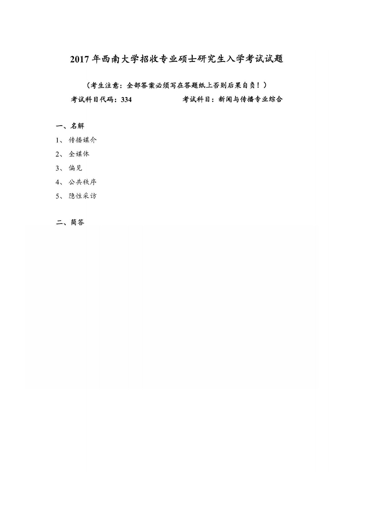 西南大学334新闻与传播专业综合能力2017年真题