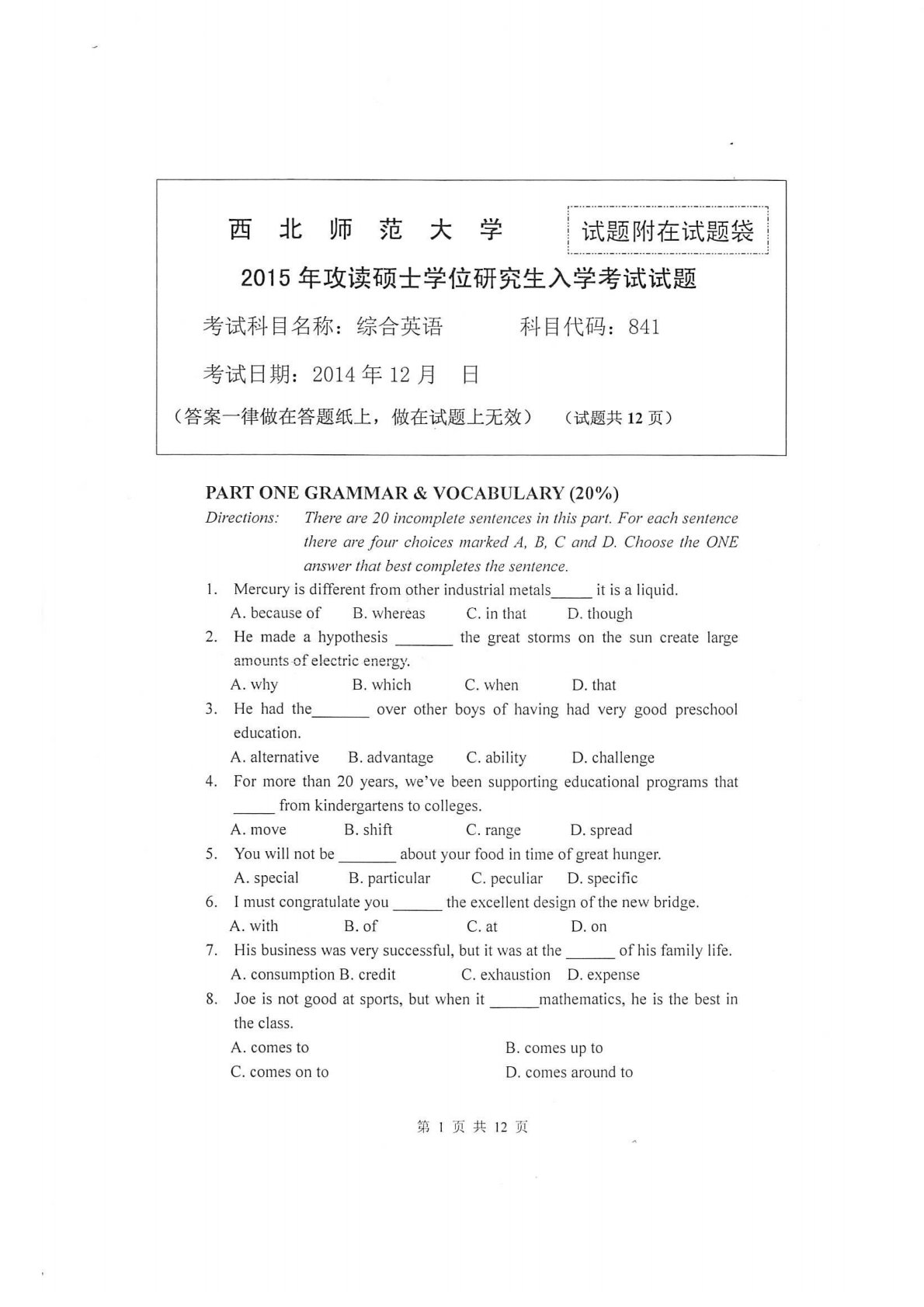 西北师范大学841综合英语2015年真题