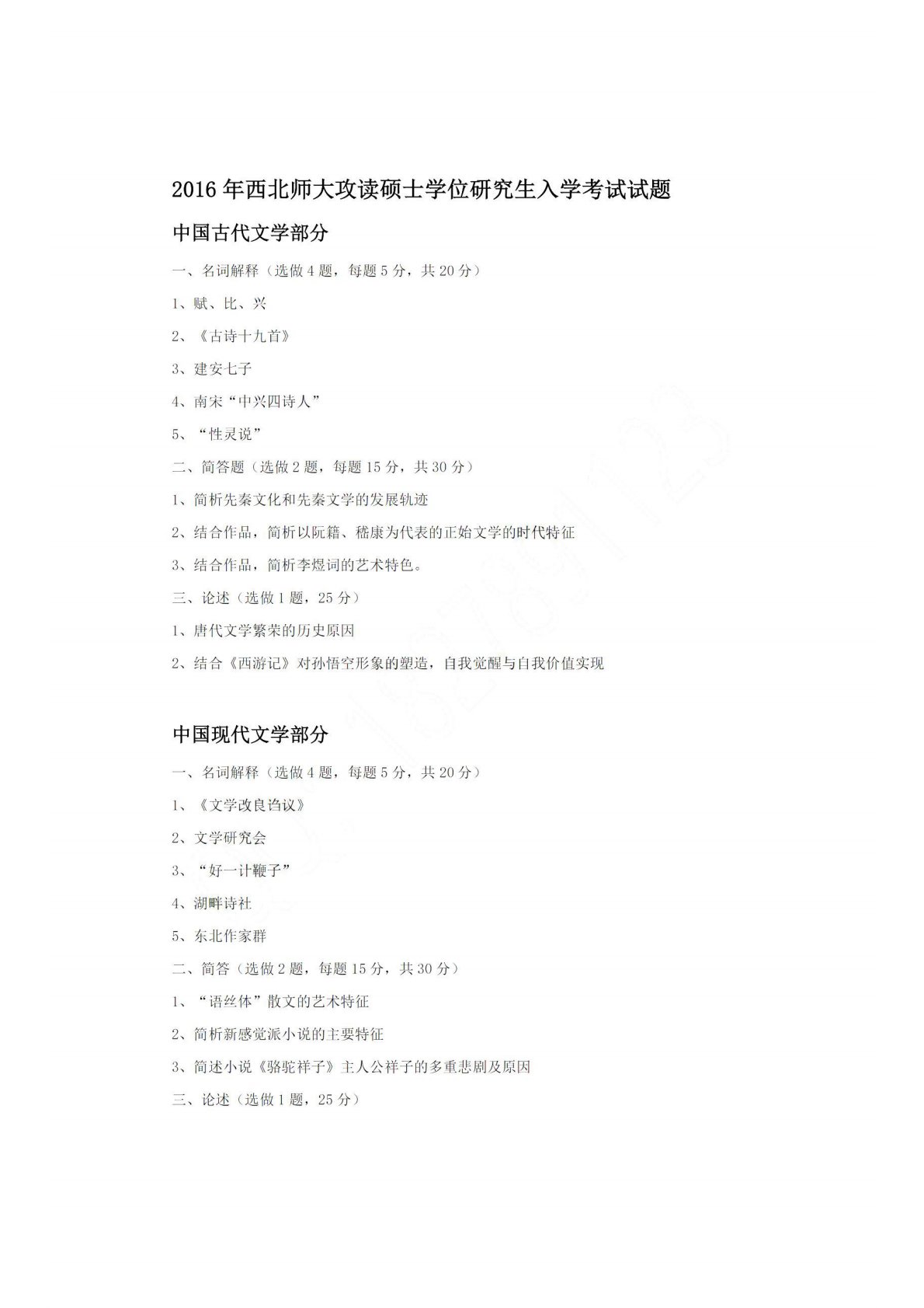 西北师范大学618中国文学2016年真题