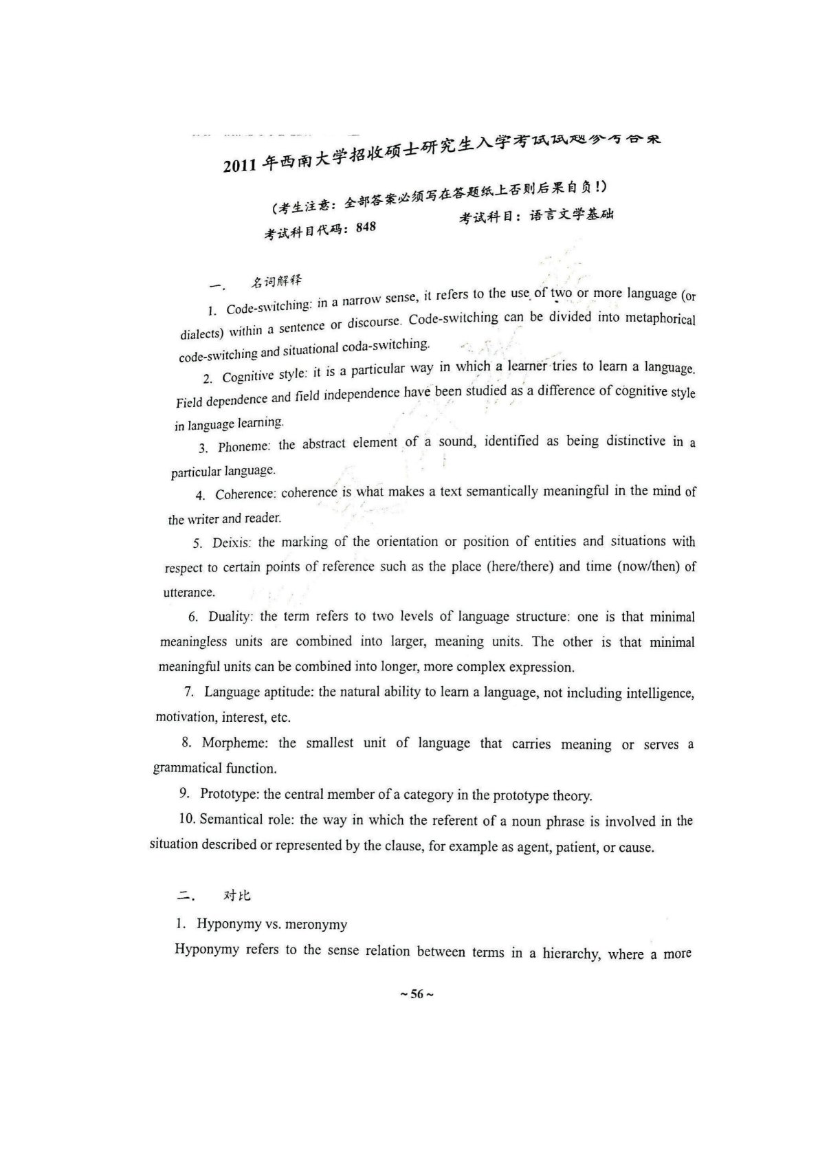 西南大学848语言文学基础2011年真题答案