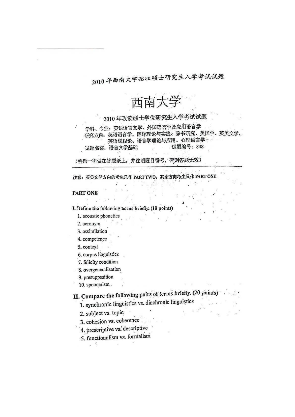 西南大学848语言文学基础2010年真题