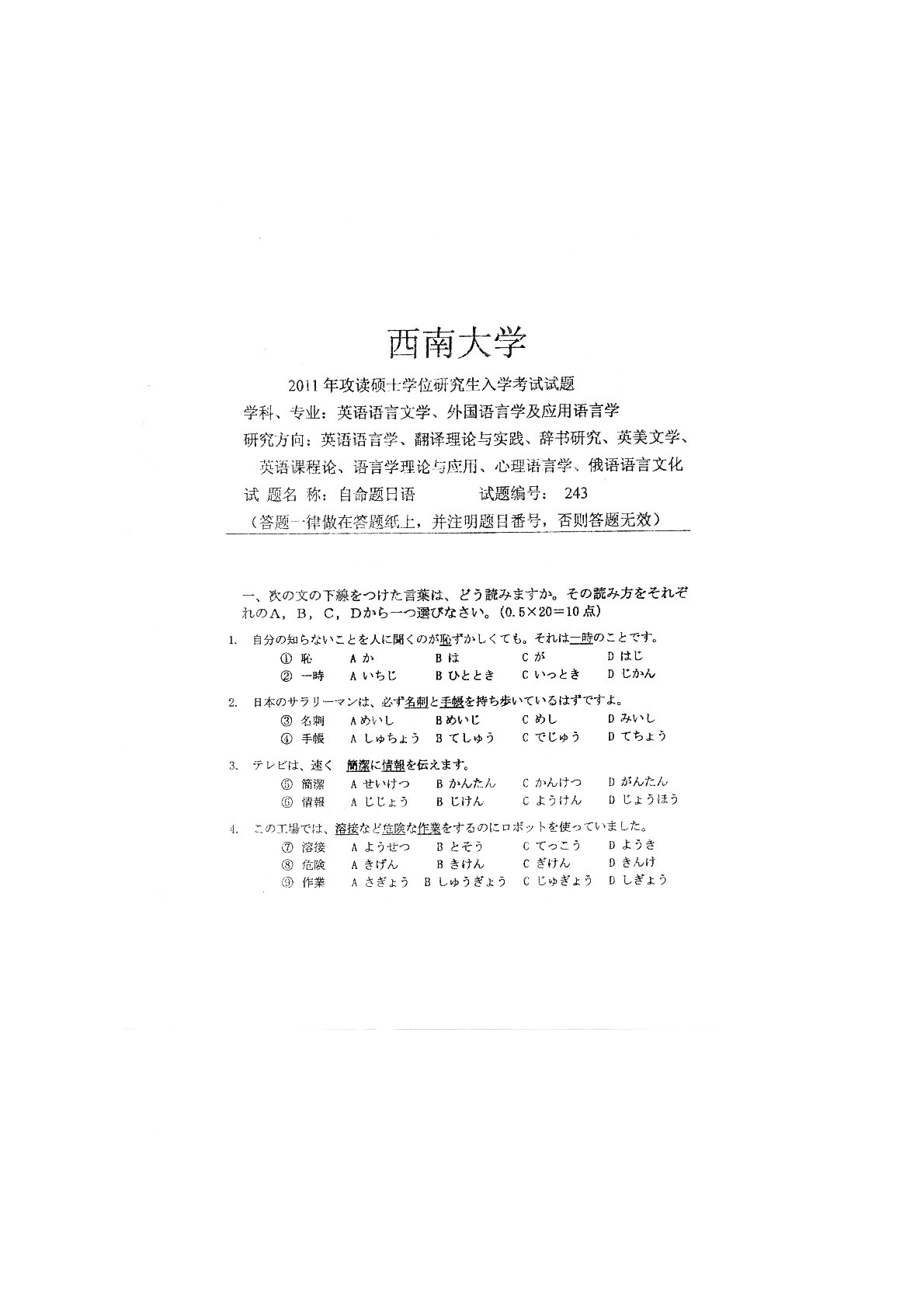 西南大学243日语2011年真题
