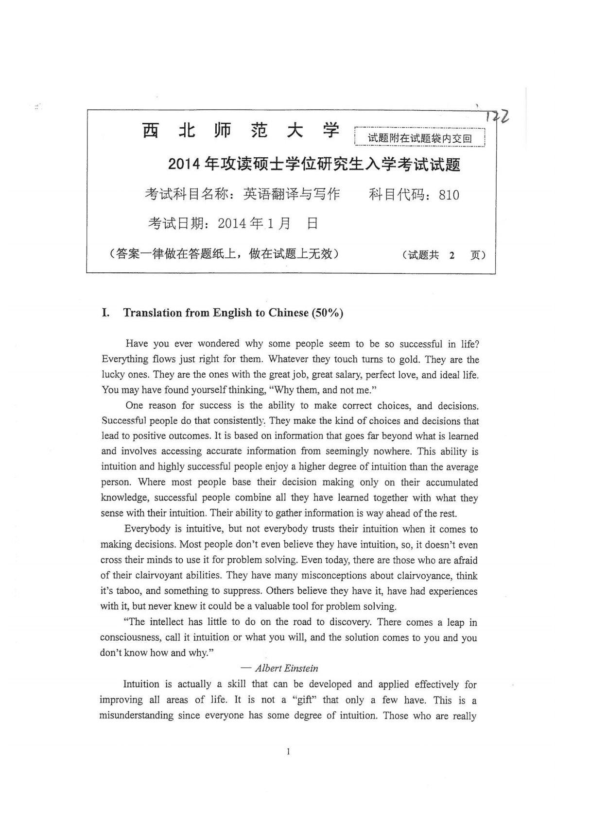 西北师范大学810英语翻译与写作2014年真题
