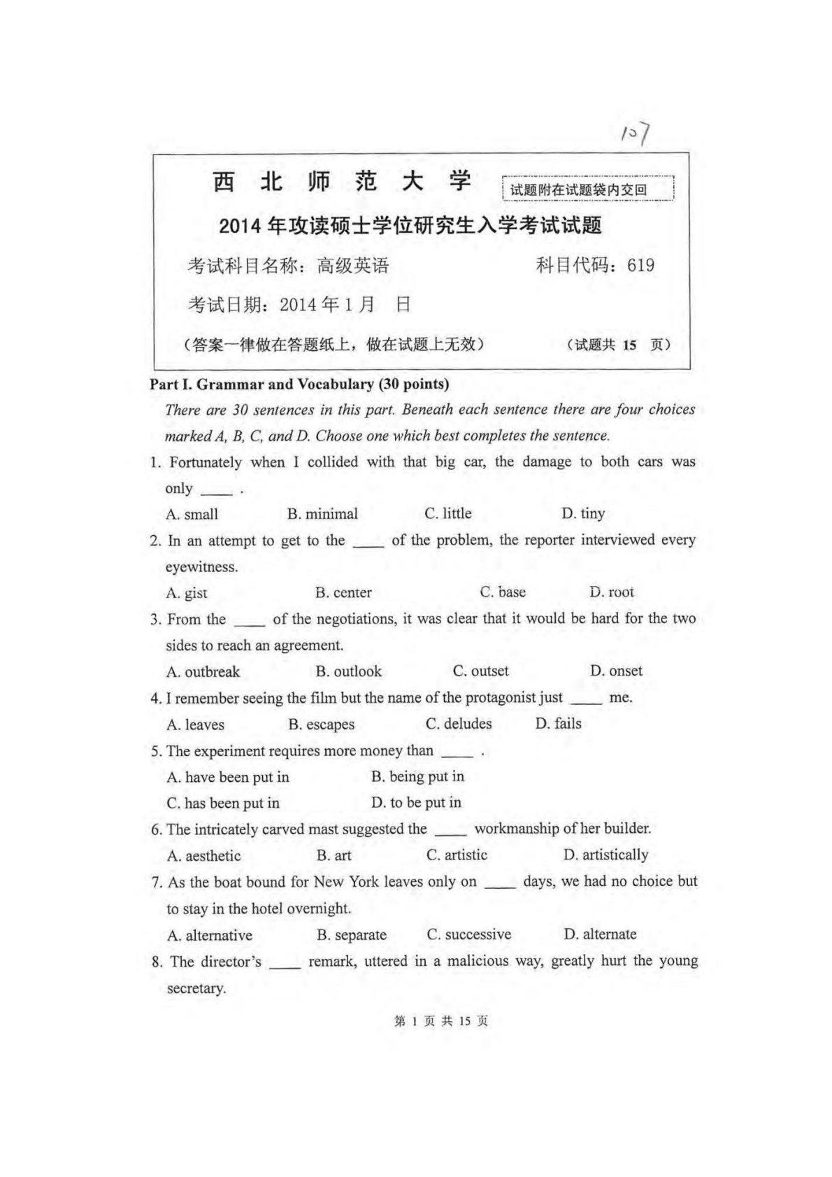 西北师范大学619高级英语2014年真题