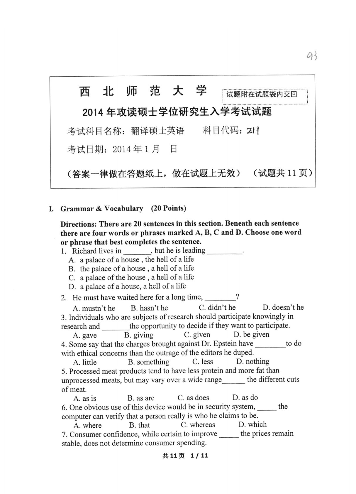 西北师范大学211翻译硕士英语2014年真题