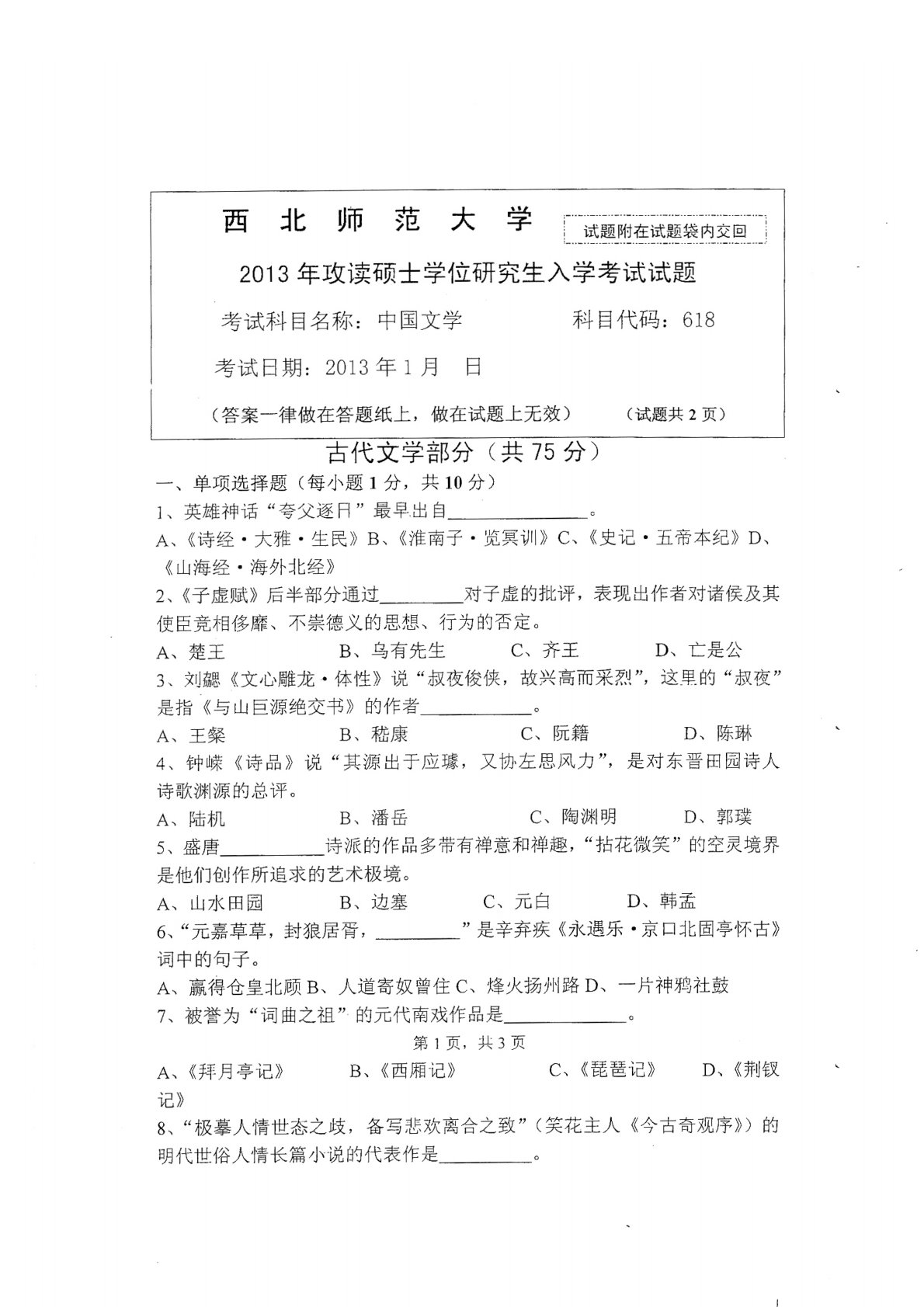 西北师范大学618中国文学(中国古代文学、中国现代文学)2013年真题