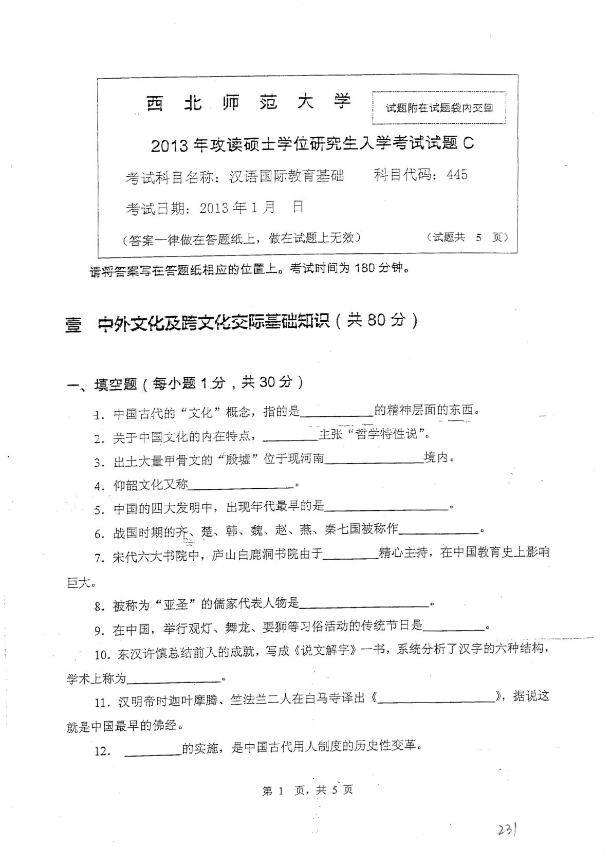 西北师范大学445汉语国际教育基础2013年真题