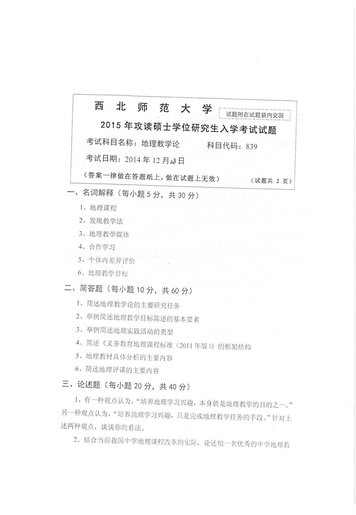 西北师范大学839地理教学论2015年真题
