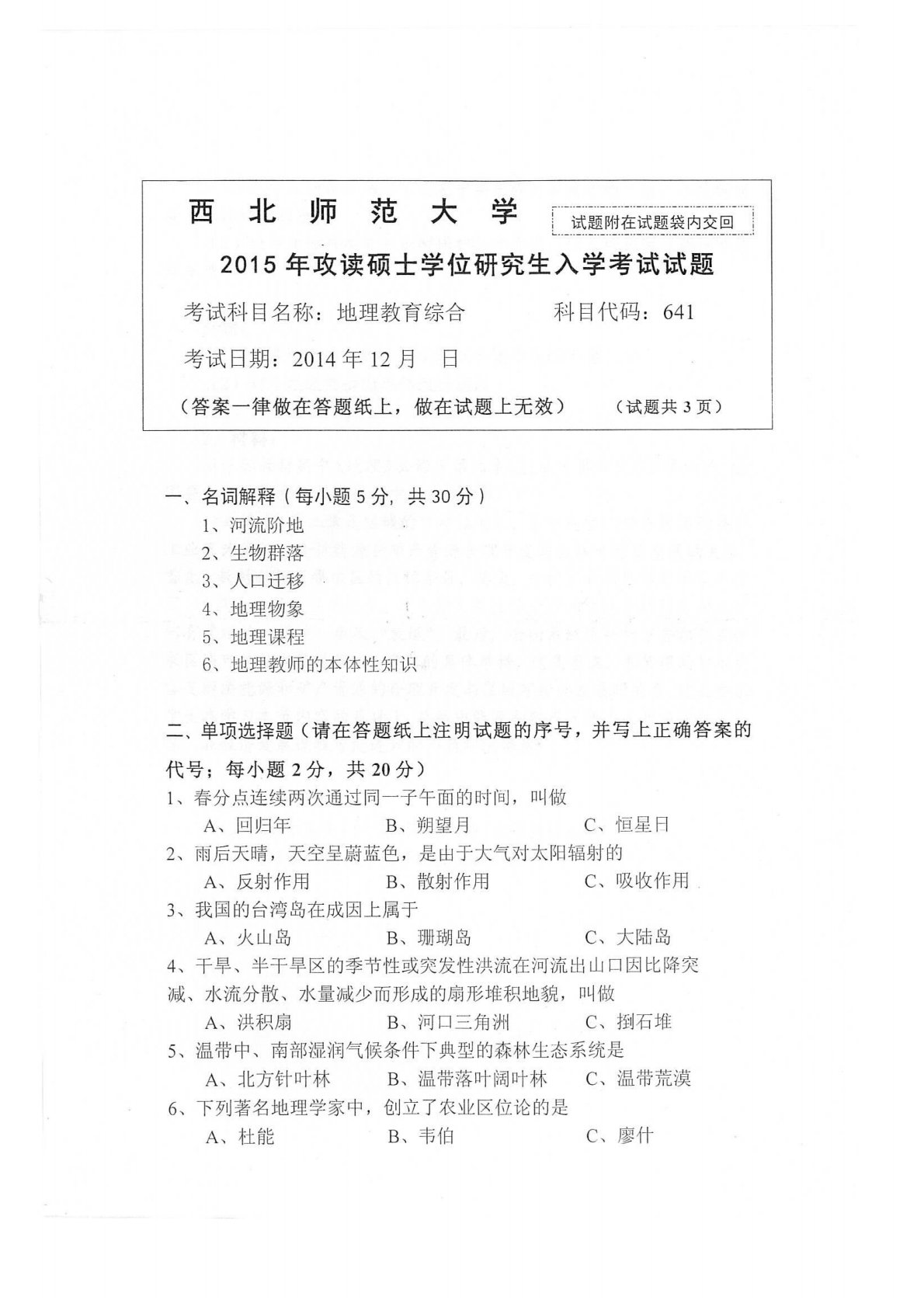 西北师范大学641地理教育综合(复试)2015年真题